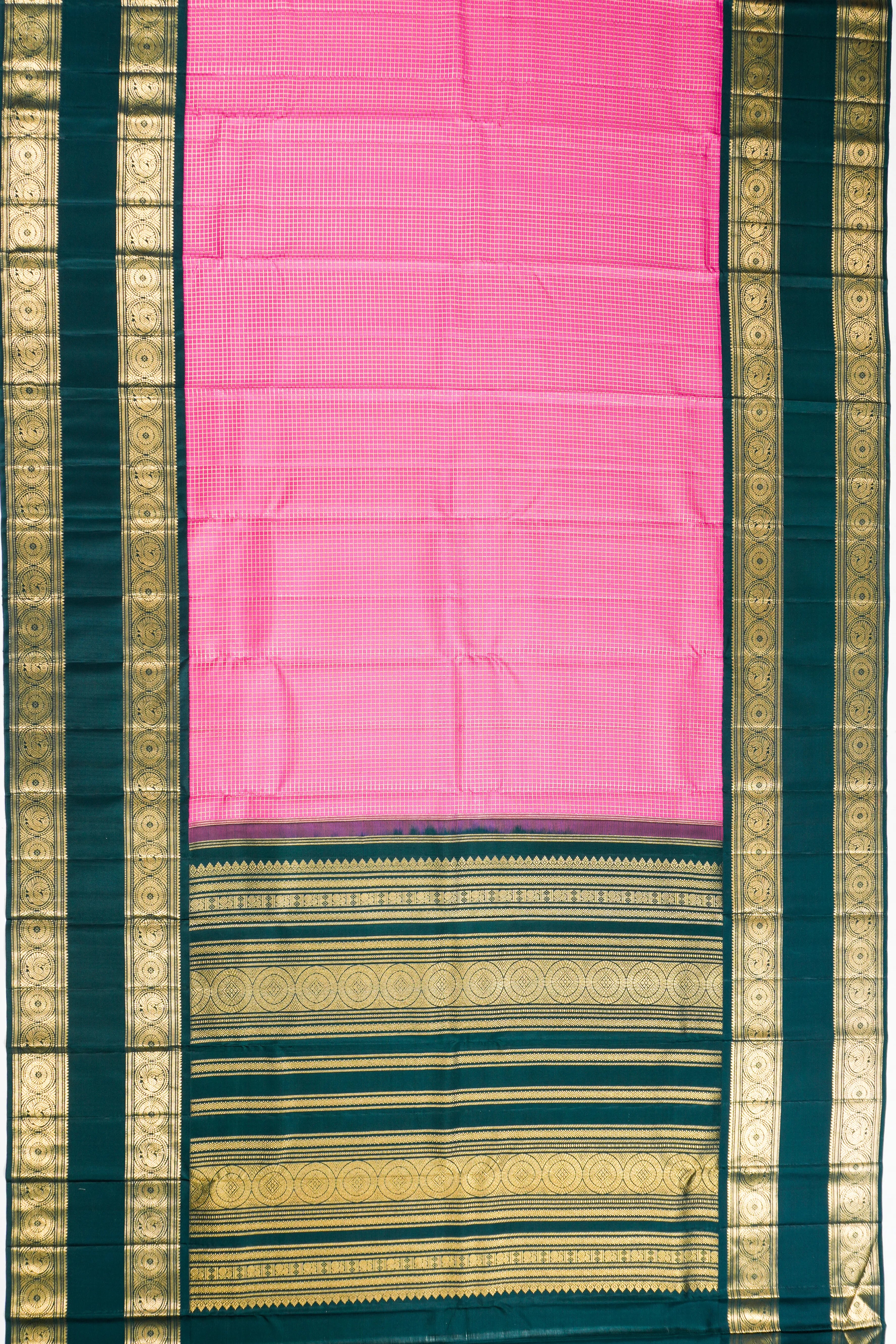 Adorn yourself with the exquisite charm of this Vintage Kanchipuram Silk Checks Pink Saree, a masterpiece of heritage weaving The saree's body is graced with gold zari checks that glisten subtly against the pink backdrop, embodying a timeless appeal