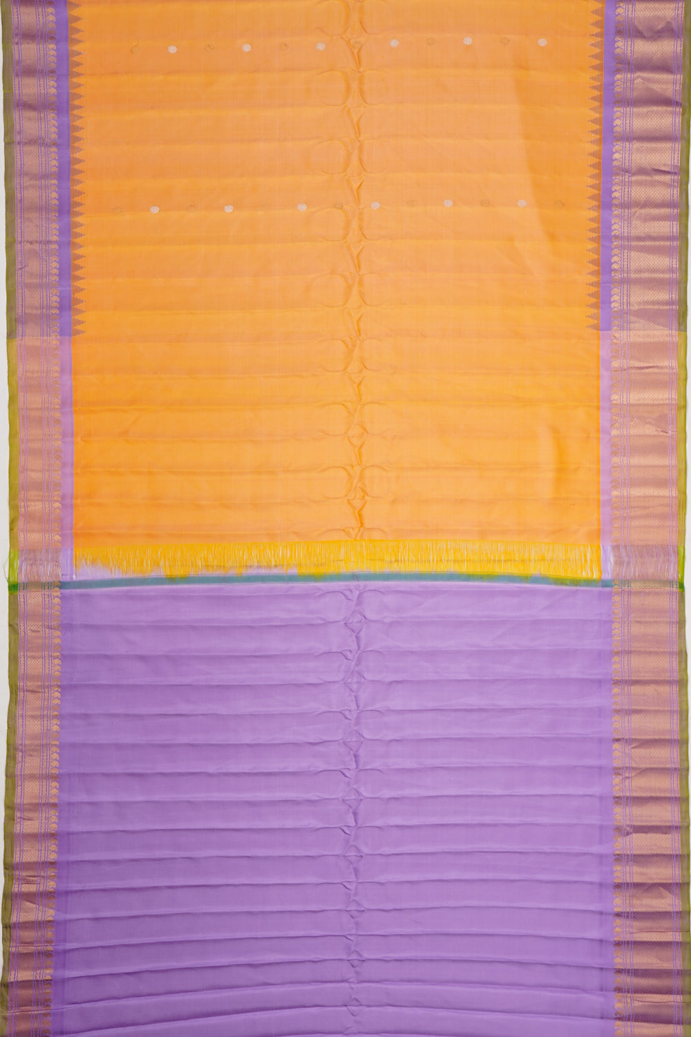 A contrast gold zari lavender border with a green edge enhances the saree's charm, creating a harmonious blend of colors that is both striking and sophisticated