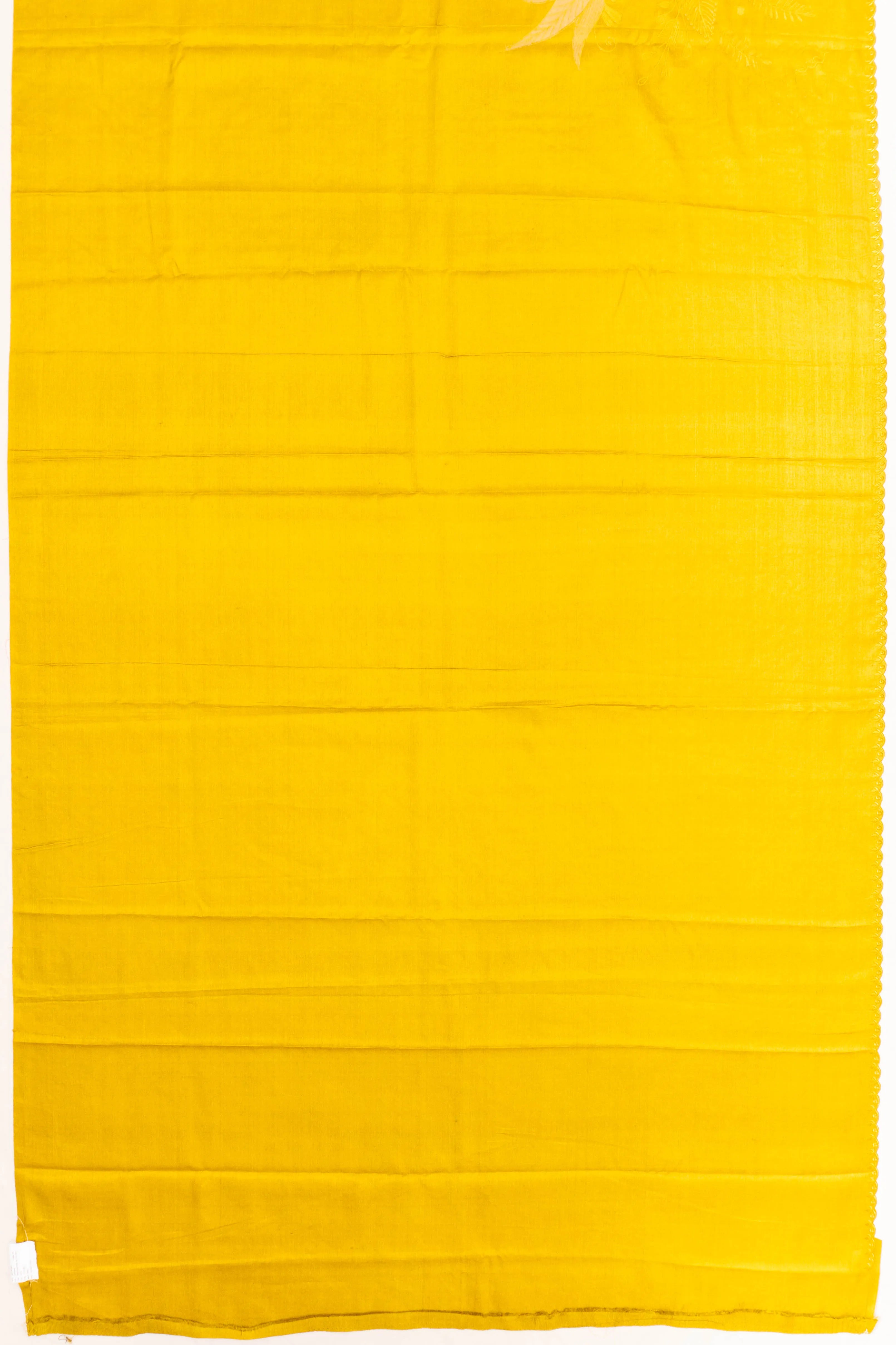 The saree features a scallop-edged design with delicate embroidery, offering a unique finish that enhances its overall charm