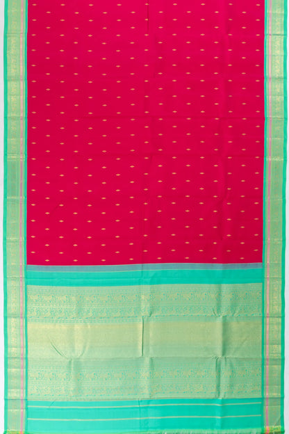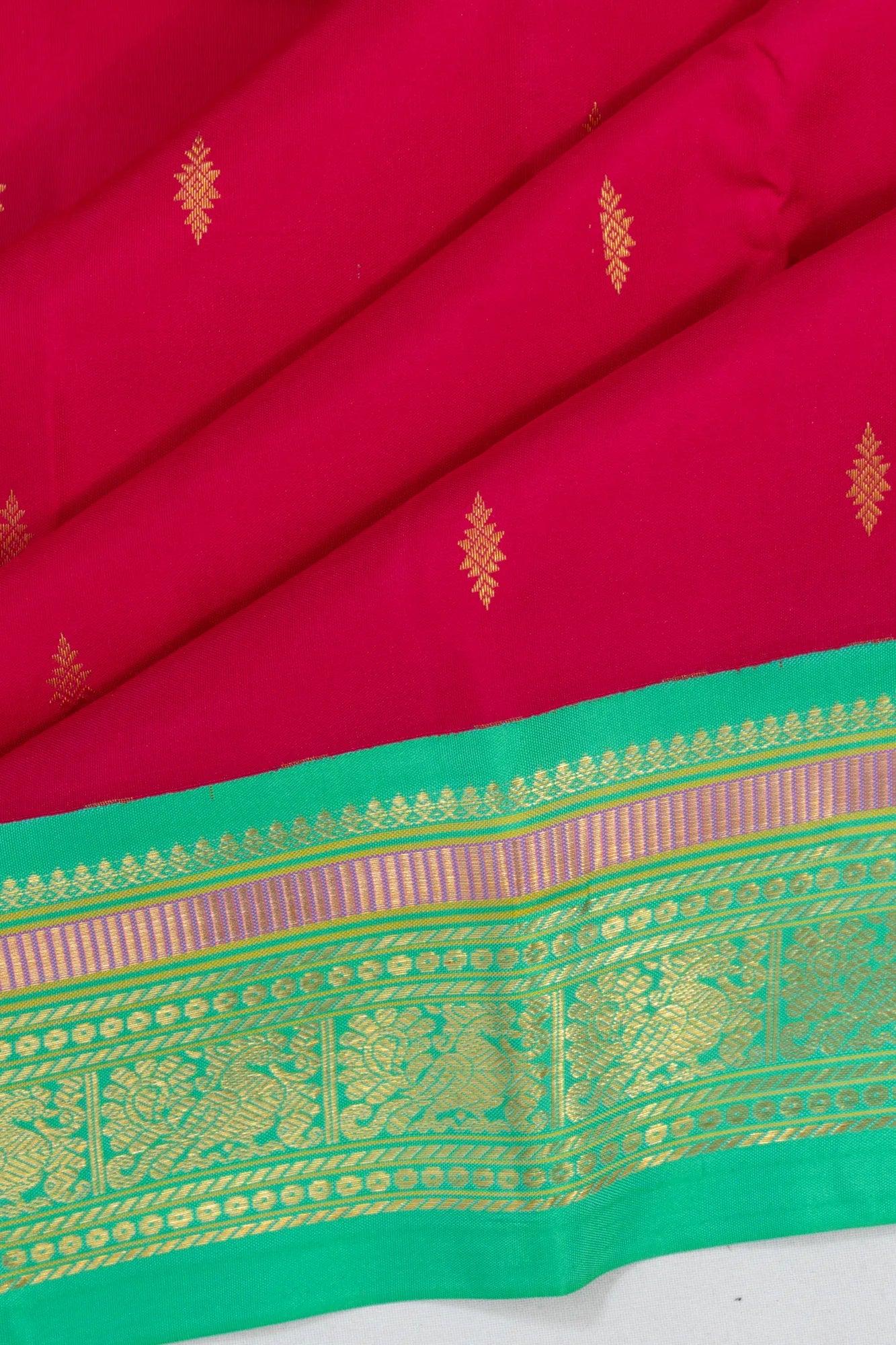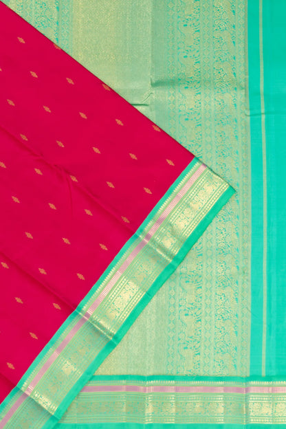 Reddish pink base beautifully woven with gold zari floral buttis, radiating festive elegance.