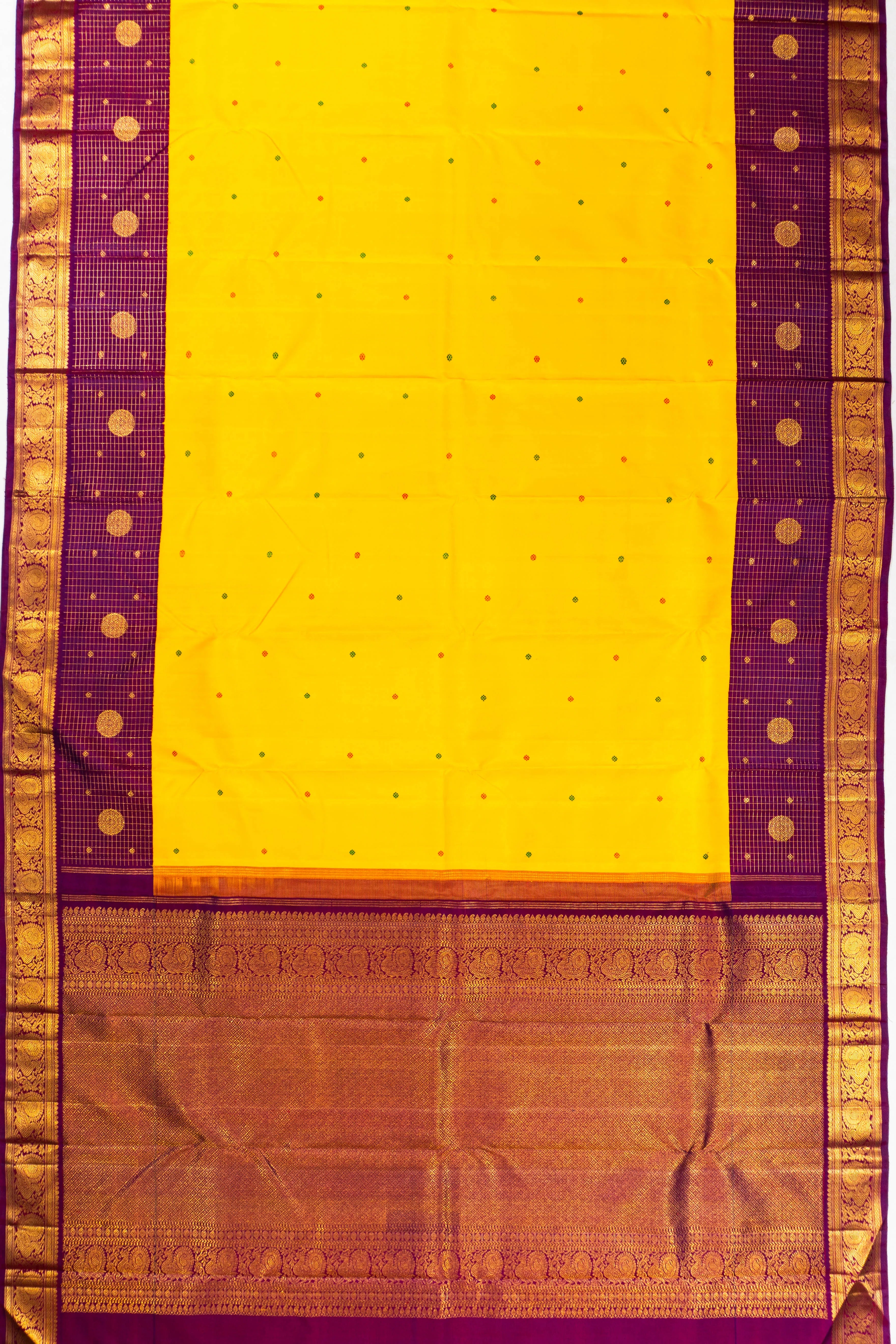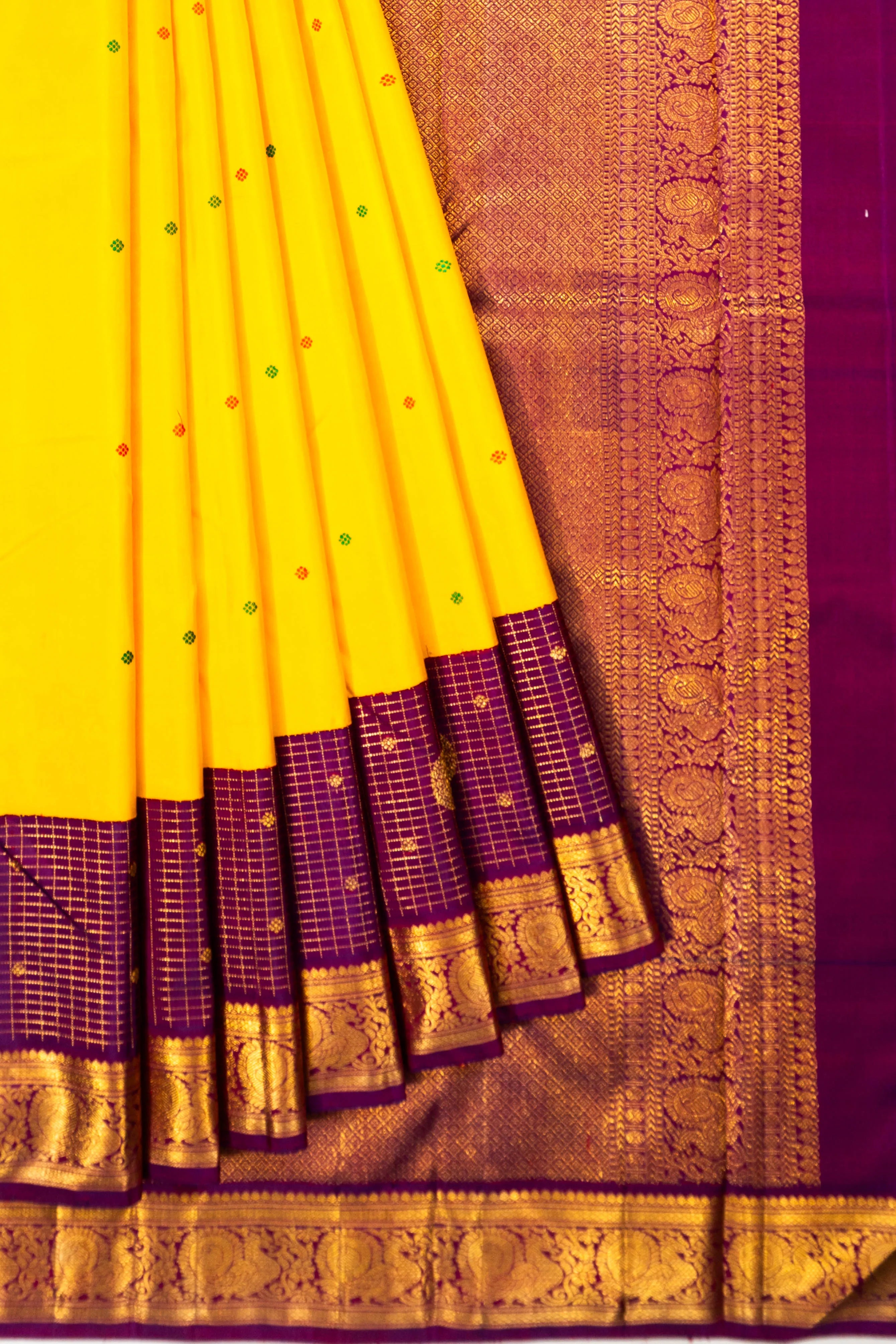 Complementing the vibrant yellow, the border stands out in a striking purple, featuring intricate gold zari checks interlaced with majestic peacock and floral motifs
