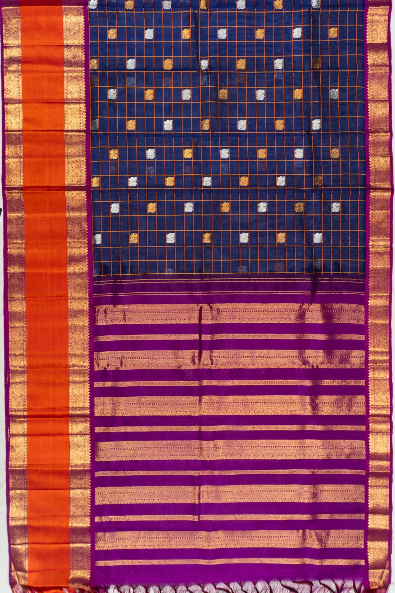Kanchipuram Kora Organza Checks And Butta Navy Blue Saree With Rettai Pettu Border