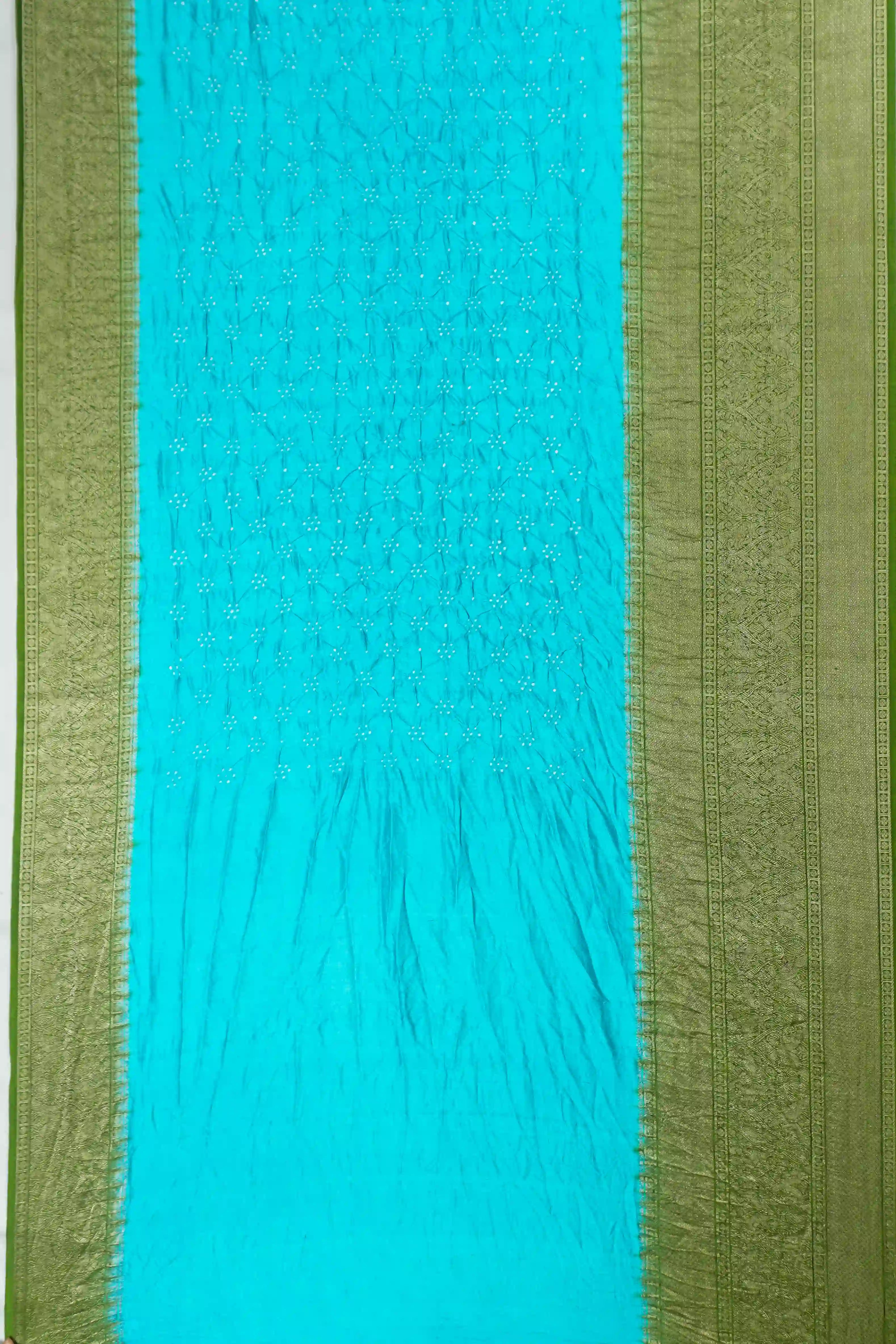The sky-blue body is adorned with delicate bandhani patterns, adding a touch of intricate artistry to your ensemble