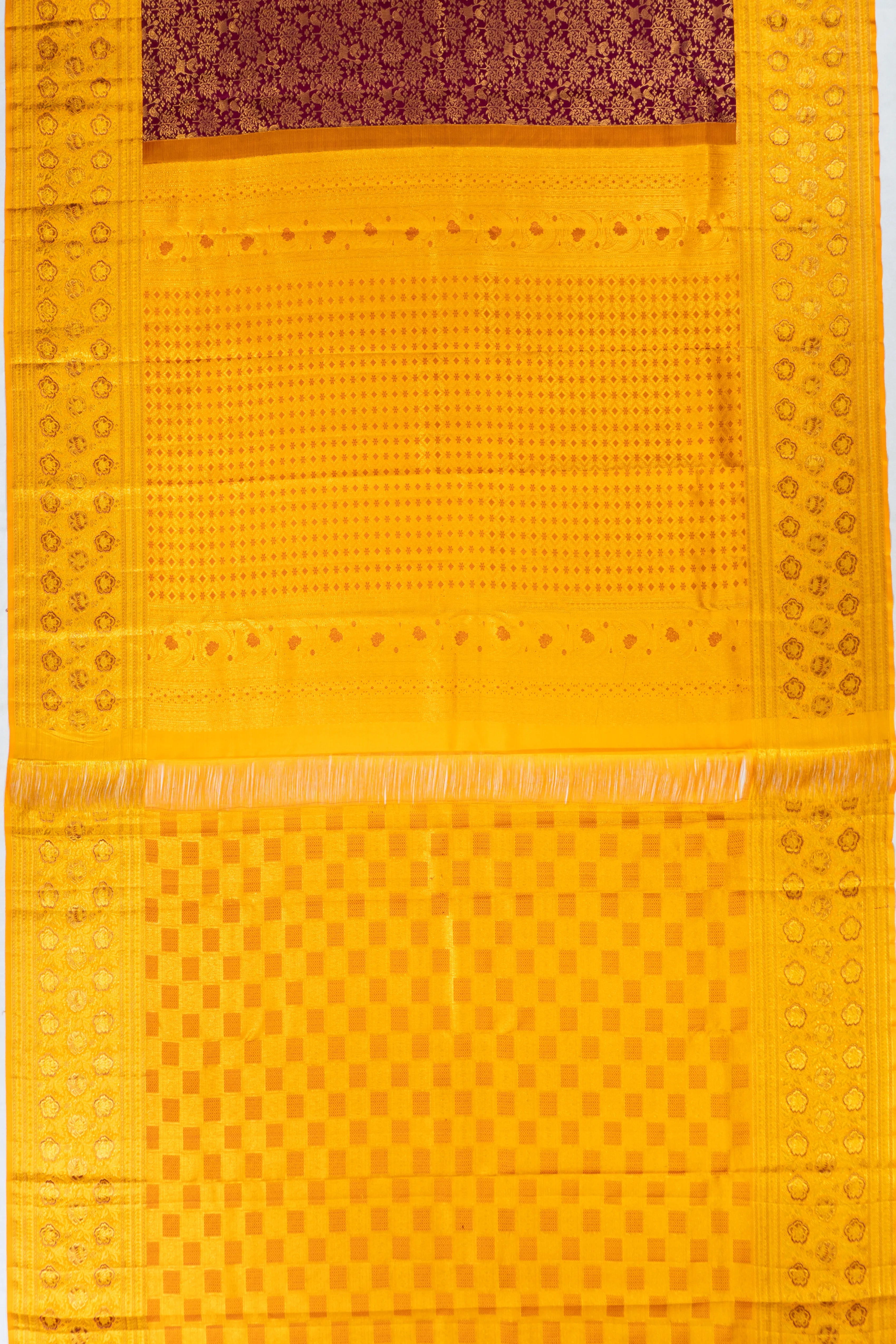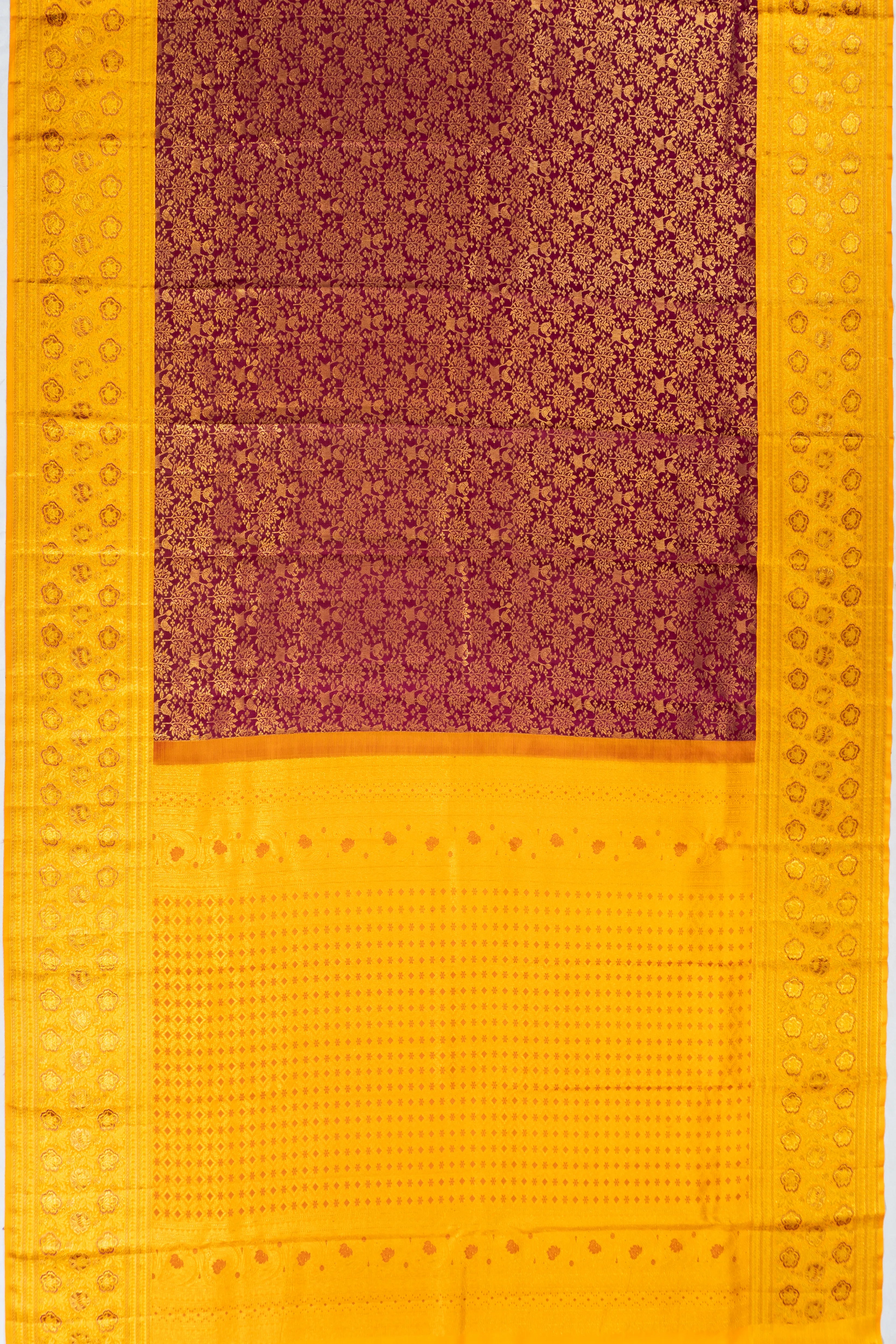 Completing this ensemble is a yellow blouse, intricately woven with gold zari floral brocade and zari borders, offering a seamless and elegant finish