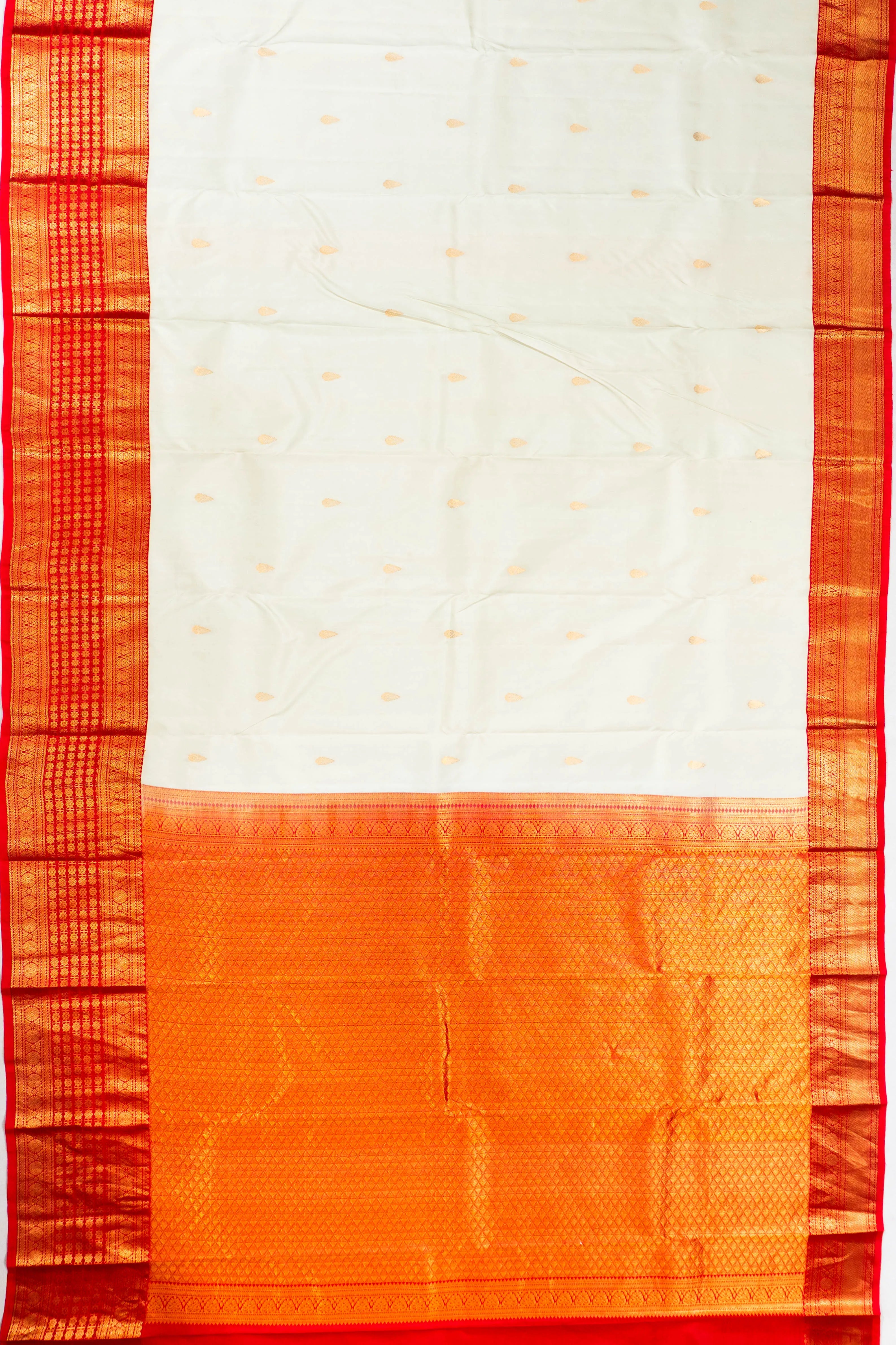 This elegant saree features a striking contrast with a medium red border, beautifully woven with gold zari floral brocade