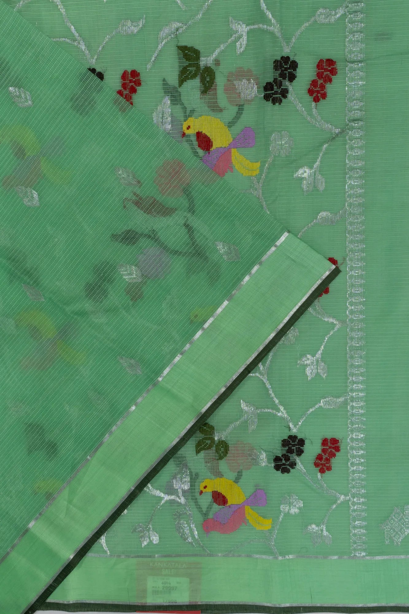 Its border features a harmonious blend of self-patterned silver zari stripes and a dark green edge, enveloping the saree with understated sophistication