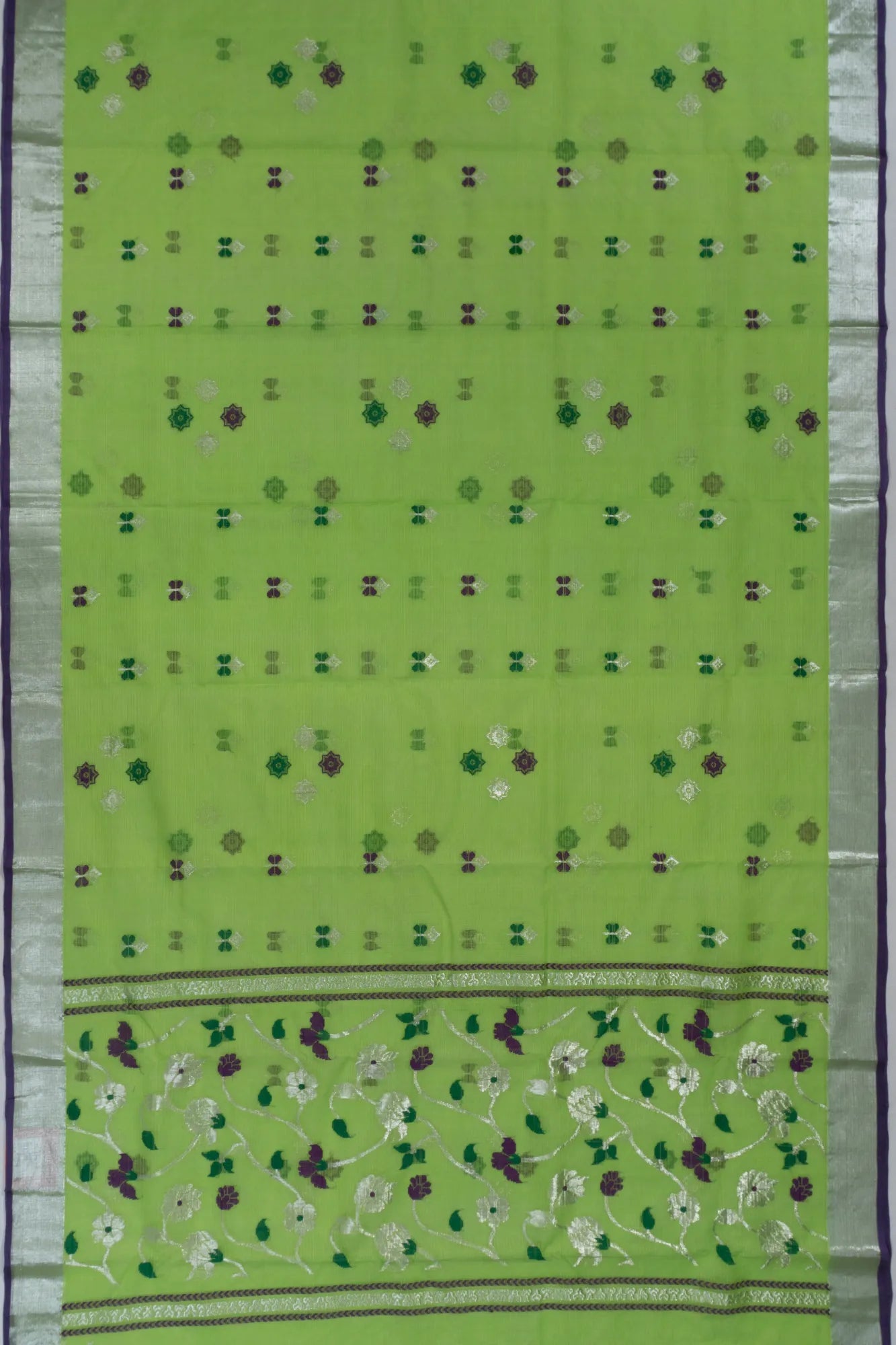 The saree features a self silver zari kaddi small border, accentuated with a violet edge that adds a touch of vibrant contrast