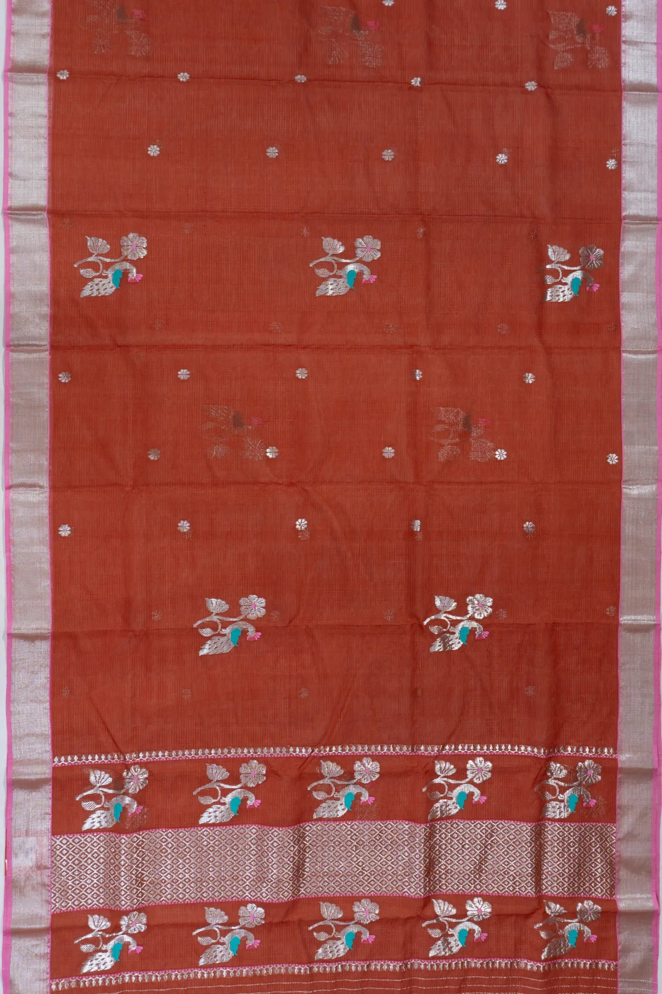 The body is adorned with delicate silver zari floral buttas, exuding a graceful charm that is both subtle and striking