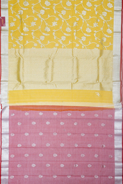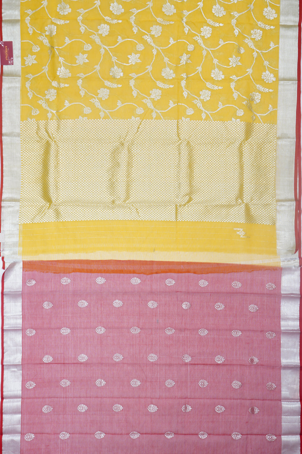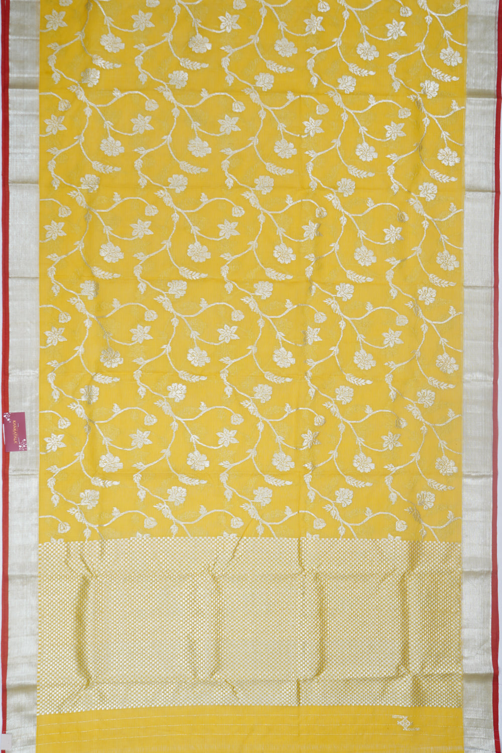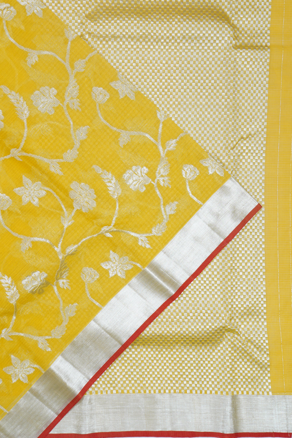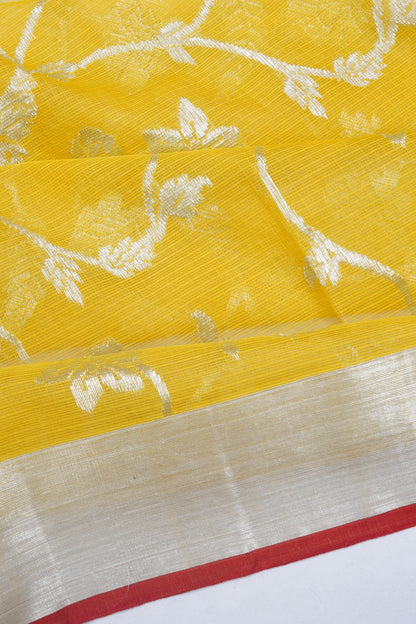 Zari Kota Cotton Jaal Yellow Saree. This exquisite Zari Kota Cotton Jaal Yellow Saree from Kankatala features a small, contrast Zari border, making it a perfect choice for weddings The body boasts a beautiful Jaal pattern Experience the legacy of Kankatala, handpicking the finest drapes since 1943