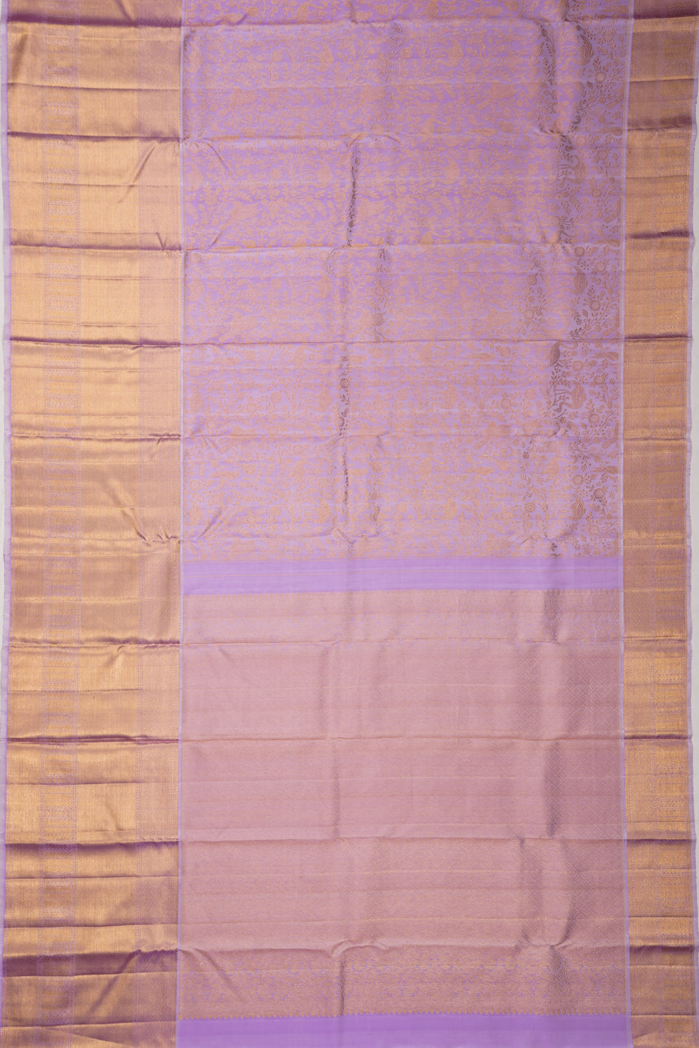 Experience the allure of tradition with our Kanchipuram Silk Brocade Lavender Saree, a testament to exquisite craftsmanship The saree's body shimmers in the gentle hue of lavender, enriched with delicate patterns that speak of heritage and grace, making it a splendid choice for momentous occasions