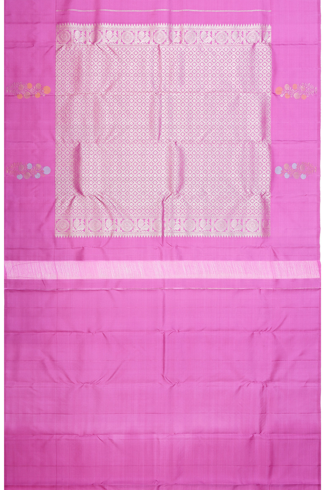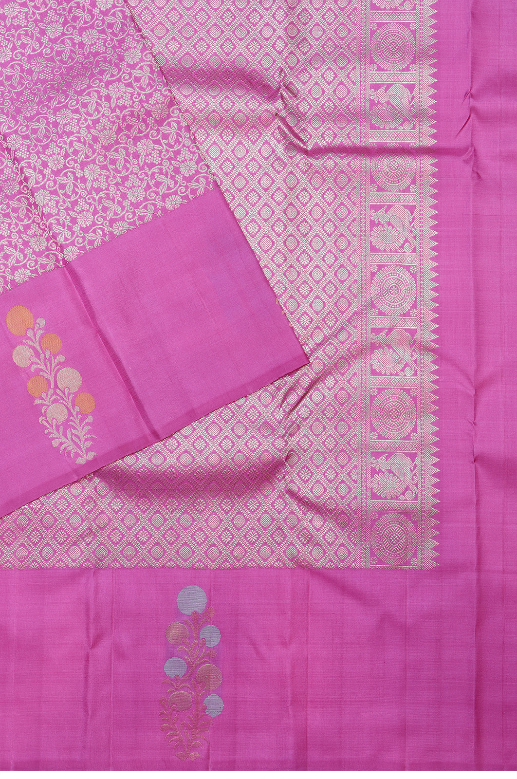 The pallu is adorned with intricate peacock and floral motifs in series, providing a harmonious blend of tradition and artistry
