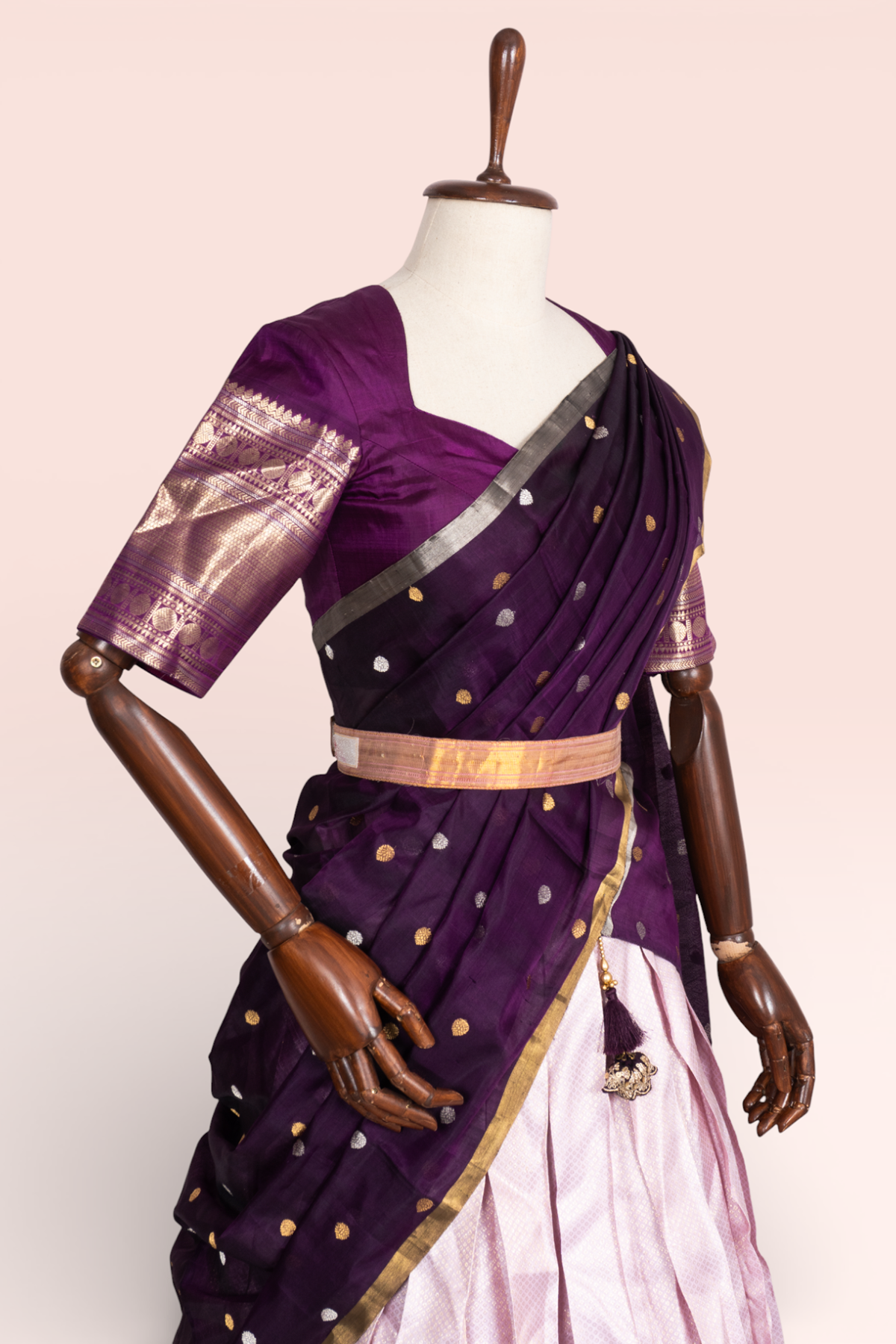 Kanchipuram Silk Brocade Baby Pink Lehenga with gold zari brocade with contrast gold zari brocade big purple border hangings