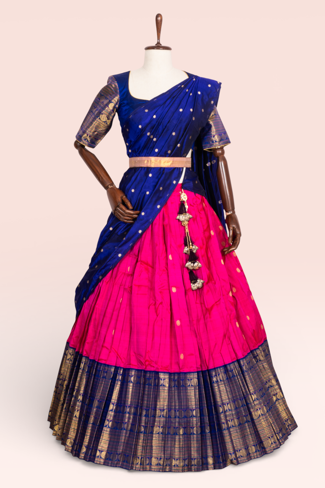Kanchipuram Silk Butta Rani Pink Lehanga with gold zari floral butta with contrast gold zari butta big blue border and hangings
