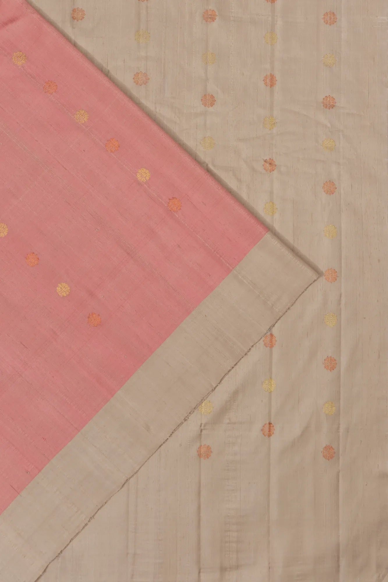 The saree's body is adorned with gold and copper zari floral buttas, creating a luxurious tapestry of shimmering motifs that captivate the eye