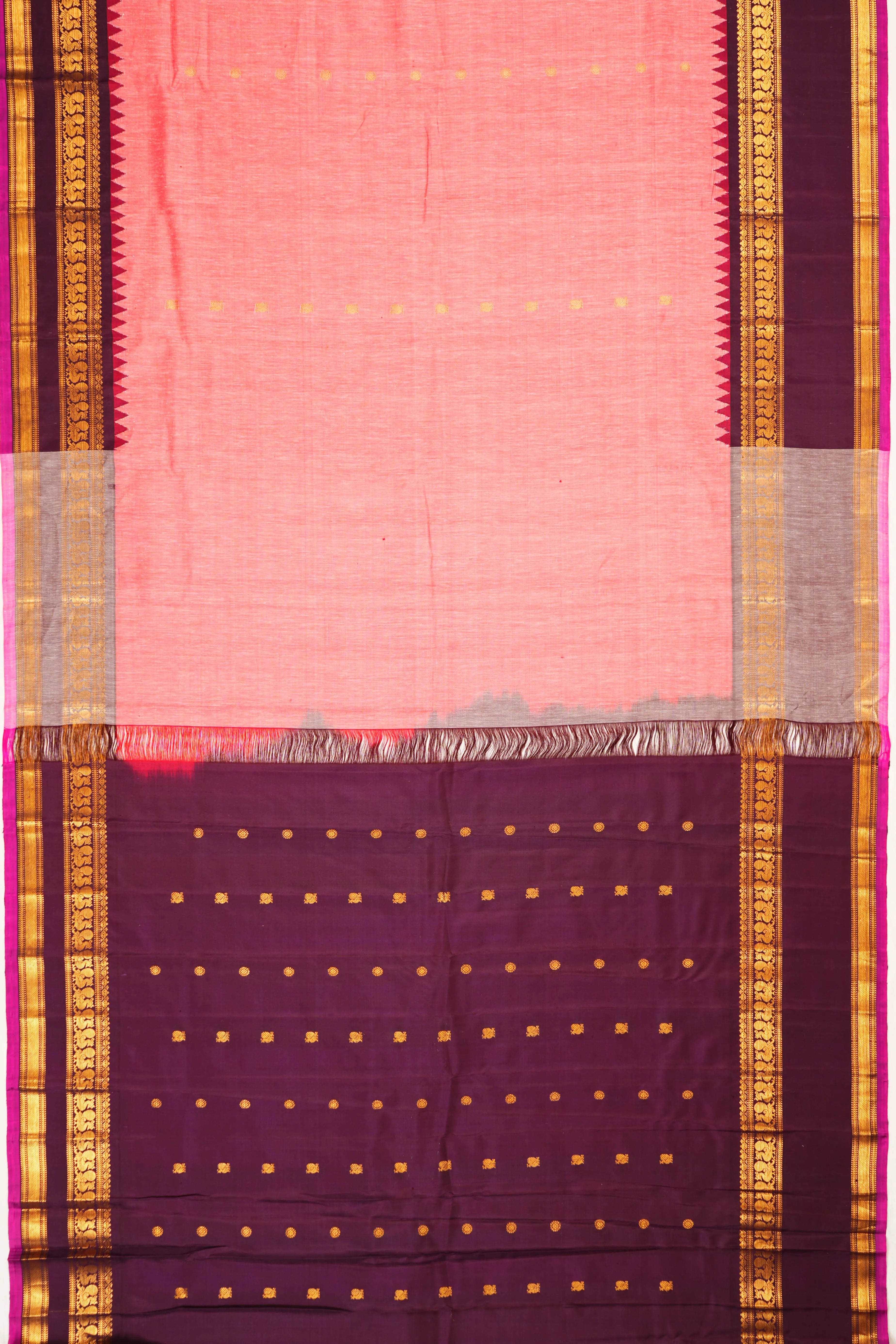 The saree is complemented with a contrast gold zari rettai pattu brown brocade medium border, which is detailed with peacock motifs in series, followed by a pink edge for added contrast.
