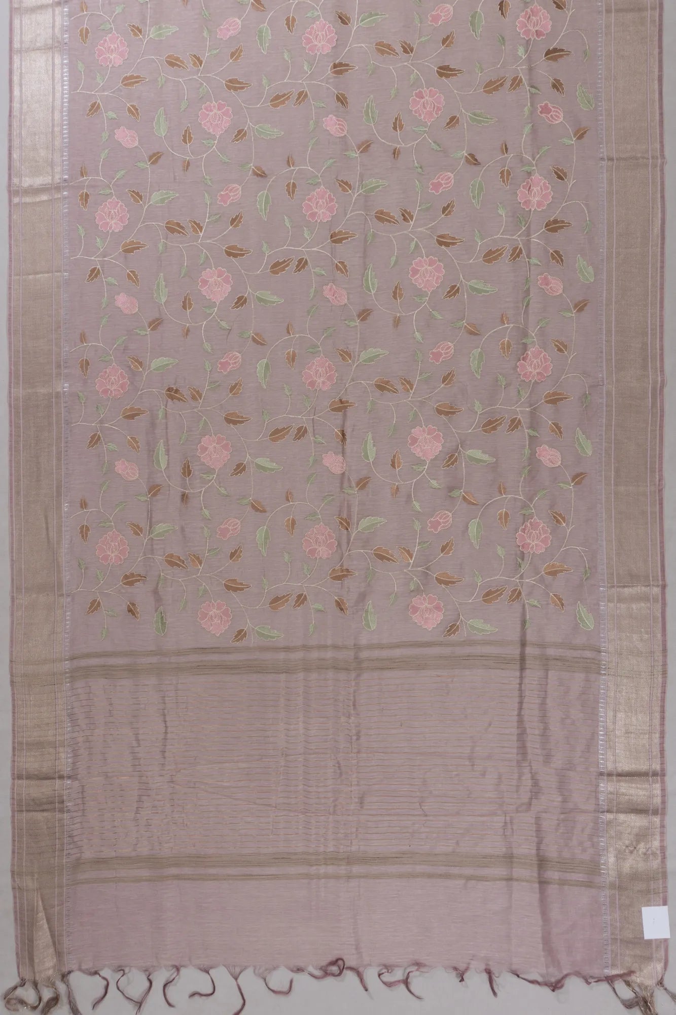 Its border features a self gold zari brocade small design, adding a touch of opulence that frames the saree with subtle sophistication