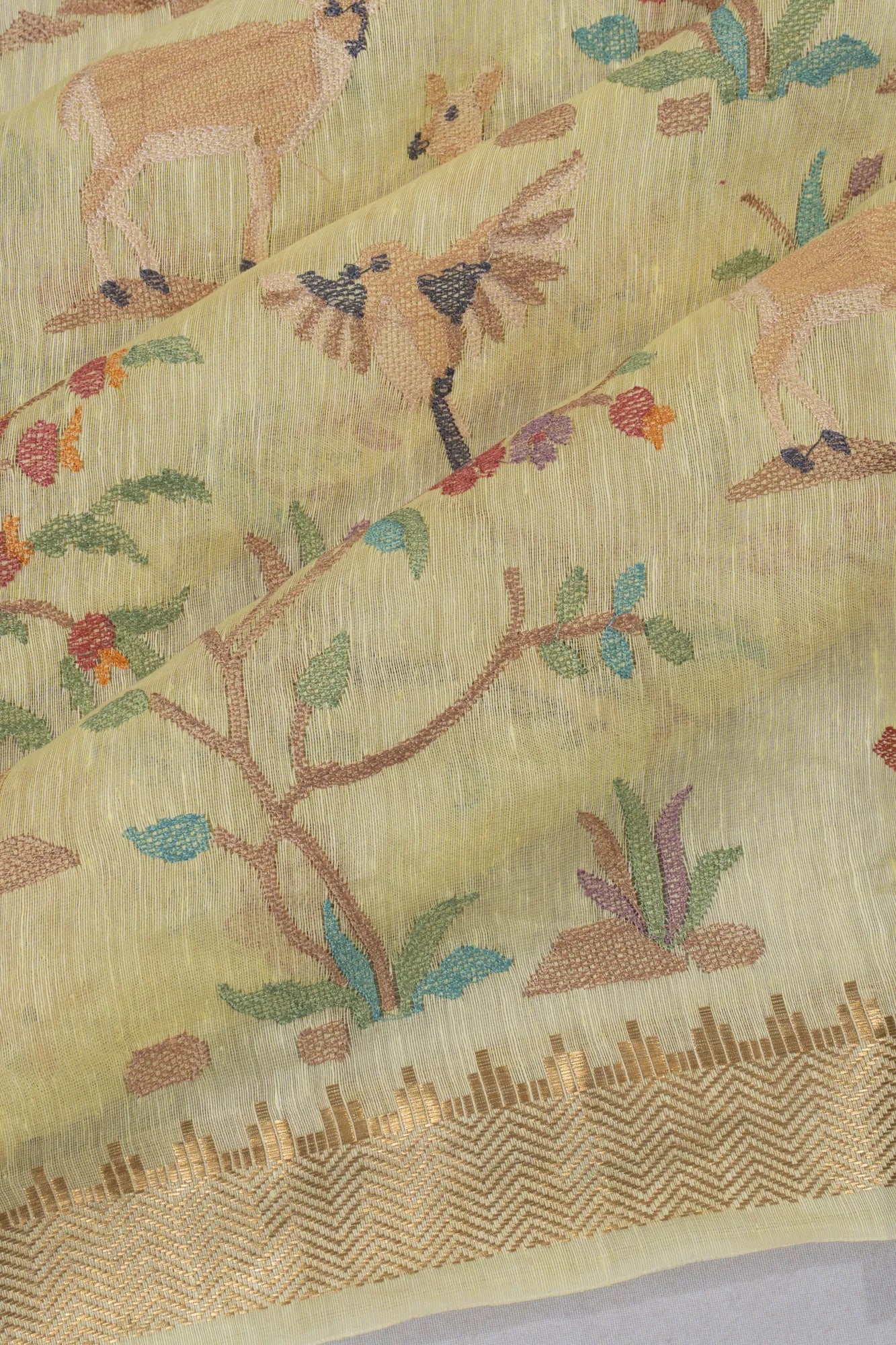 The body features multicolored floral embroidery intertwined with enchanting deer and bird motifs, creating a lively tapestry of nature-inspired artistry