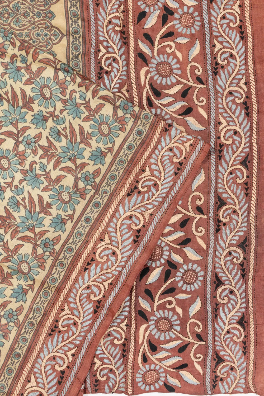 Some of our most sought-after new fancy sarees come from our signature fusion collections, where we commission weavers to merge distinct art forms into single extraordinary pieces. Imagine Kalamkari hand-painting on a Kanchipuram silk base. Picture delicate Chikankari embroidery adorning a Paithani. Envision a Patola saree finished with a traditional Kanchipuram border.
