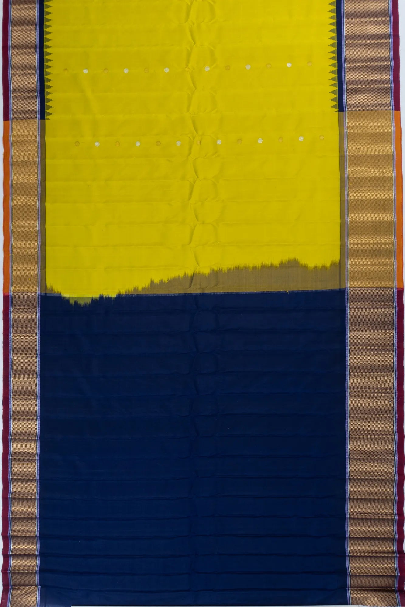 Paired with a coordinated dark blue blouse featuring zari borders, this saree embodies grace and sophistication