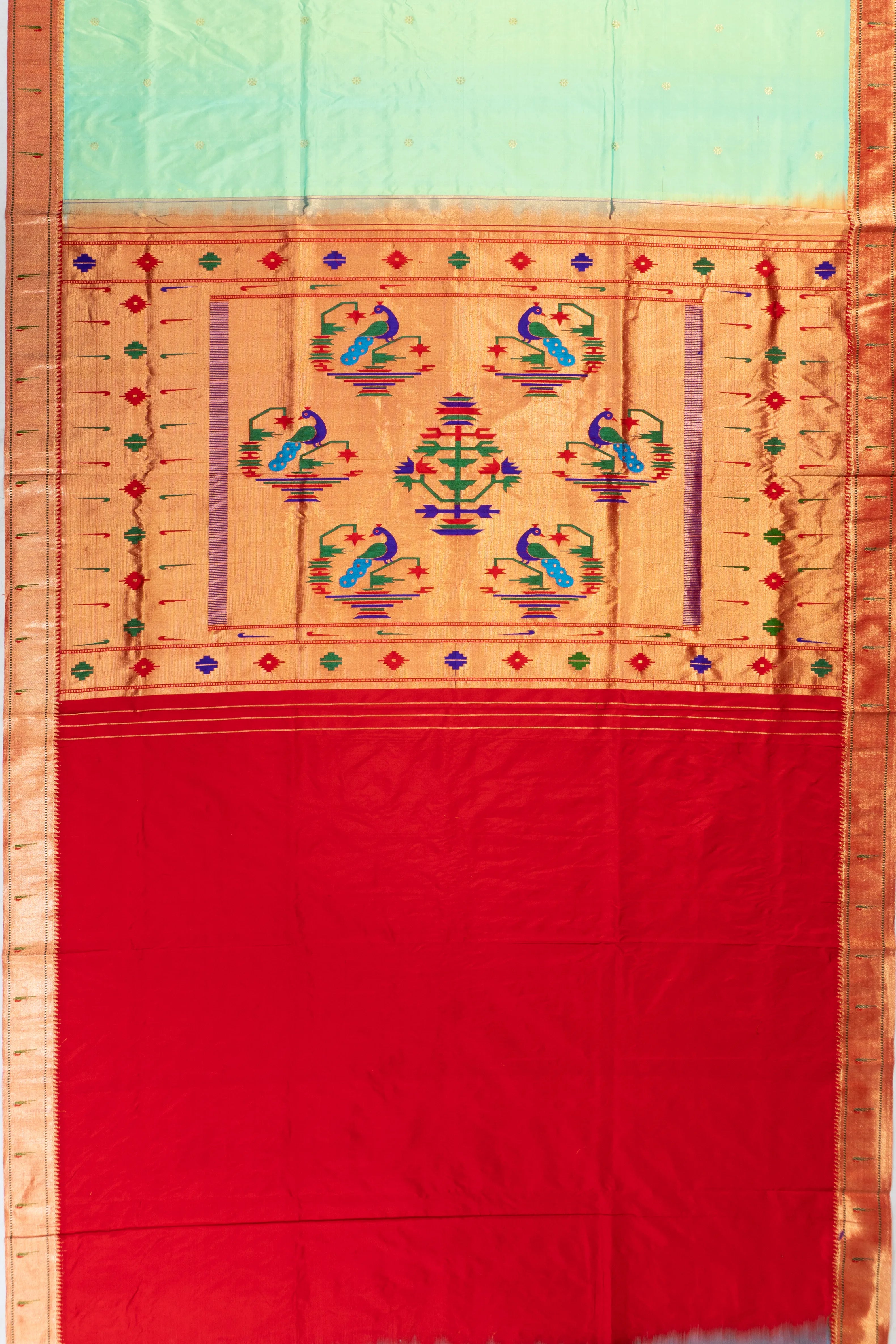 The pallu boasts a harmonious blend of gold zari tissue and intricate peacock motifs, creating a picturesque floral tapestry that exudes sophistication