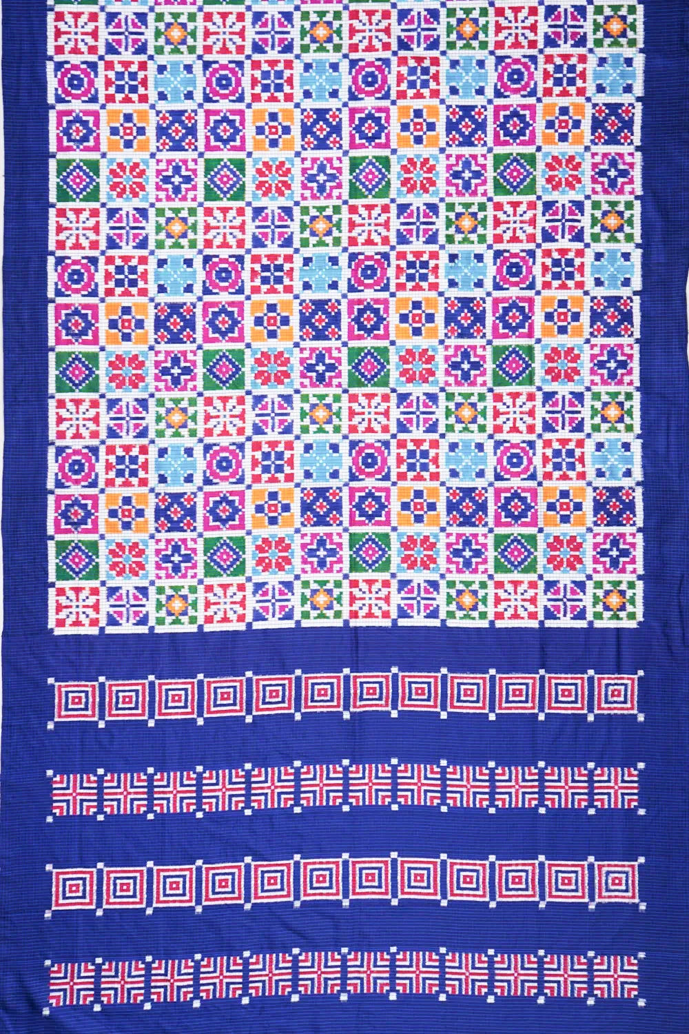 The body of the saree features an intricate play of checks and buttas, offering a contemporary twist to traditional artistry