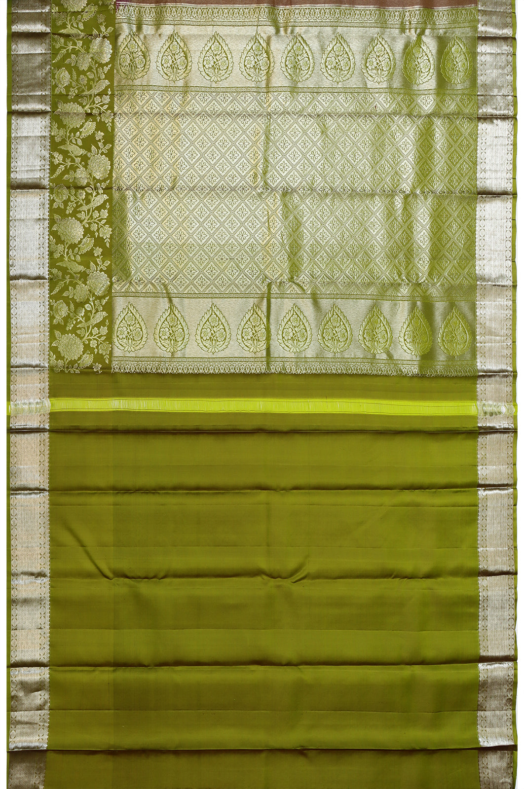 The medium green border provides a striking contrast with its silver zari kaddi design, adorned with exquisite bird motifs nestled in floral vines, adding a touch of nature-inspired artistry
