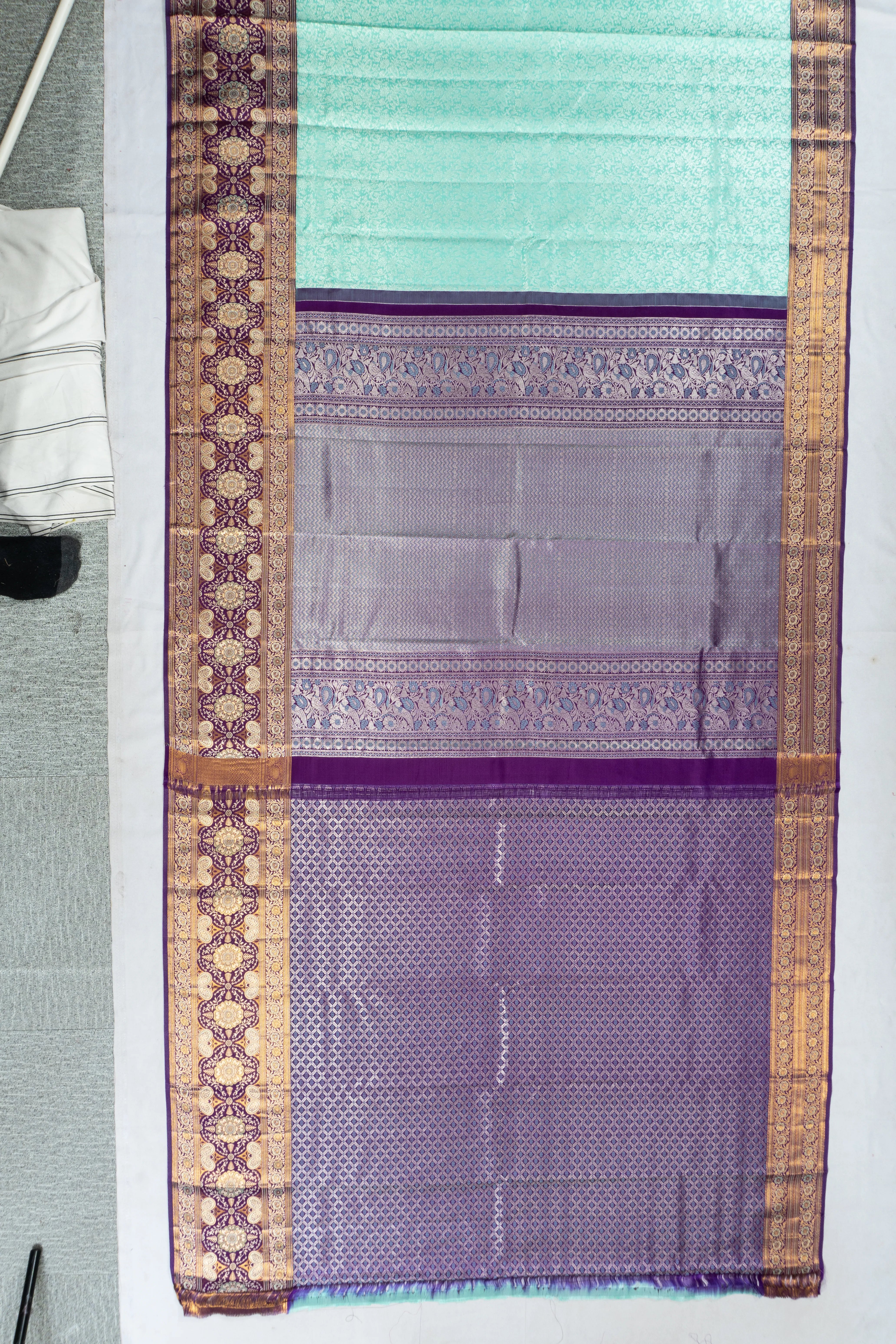 A striking contrast is provided by the gold zari floral brocade border in a rich purple tone, adorned with delicate floral vines