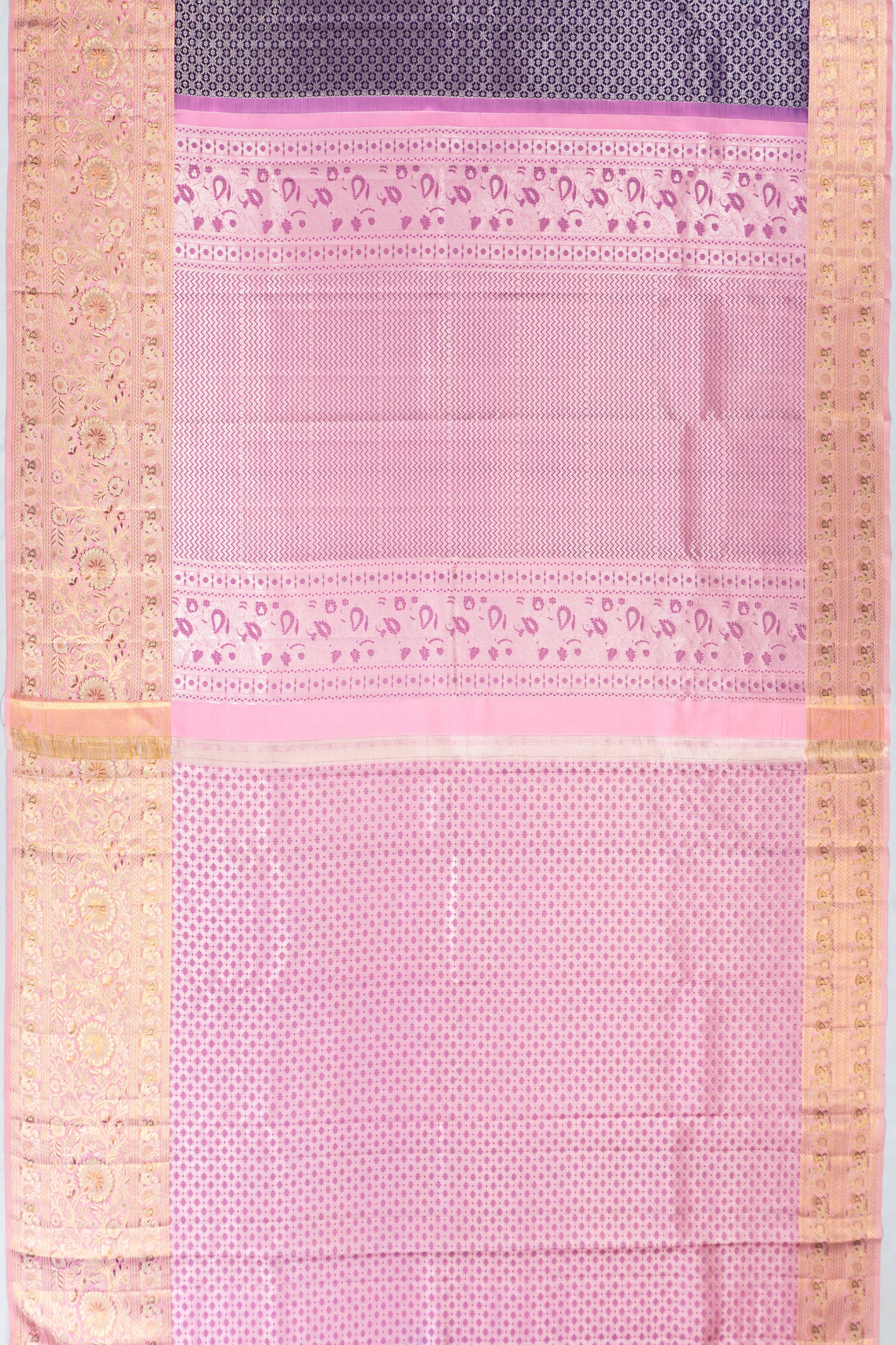 A beautifully crafted baby pink medium border, featuring gold zari floral brocade and delicate floral vines, adds a touch of regal charm