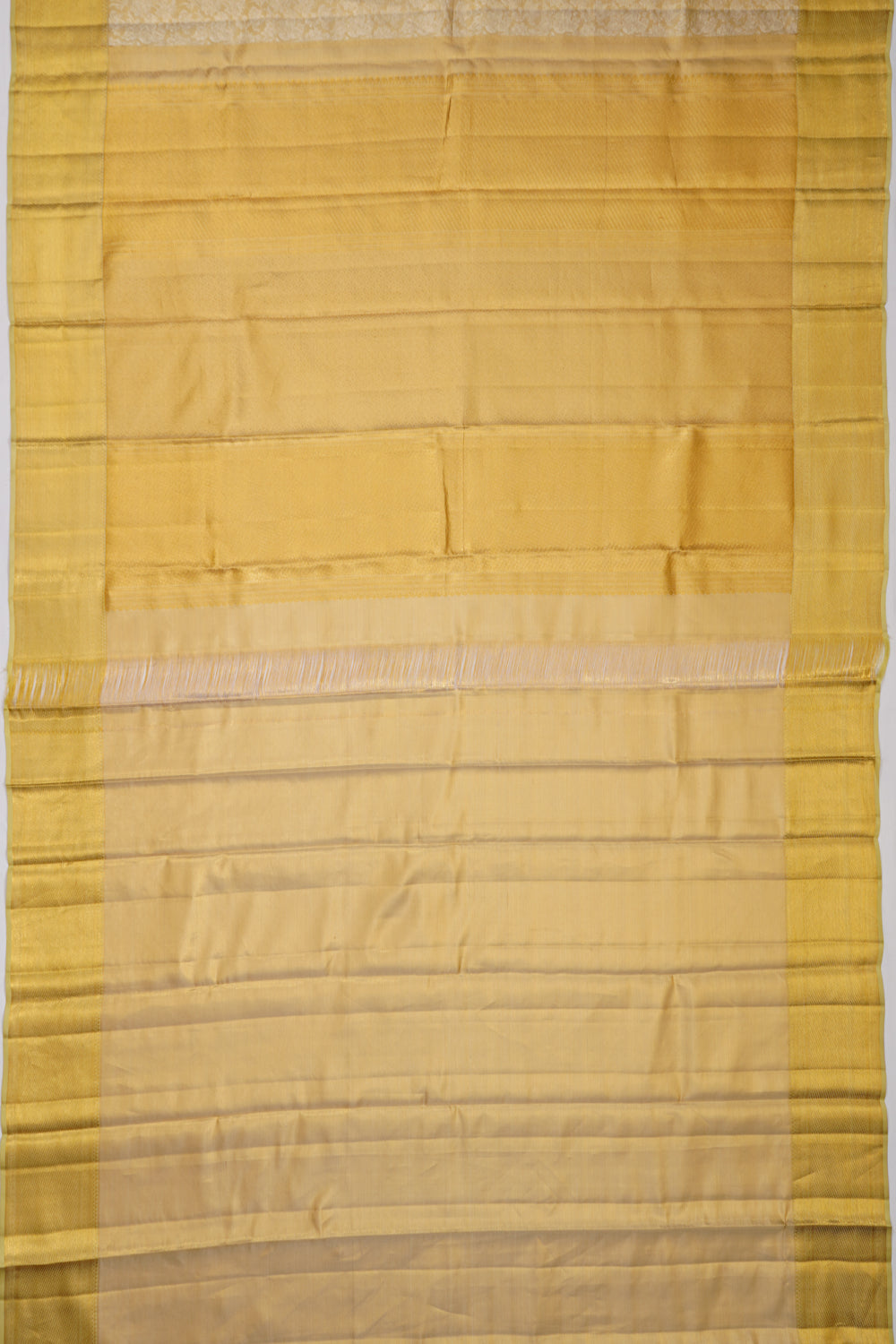 The saree features a medium-sized border adorned with self gold zari, enhancing its regal appeal with a touch of subtle yet striking elegance
