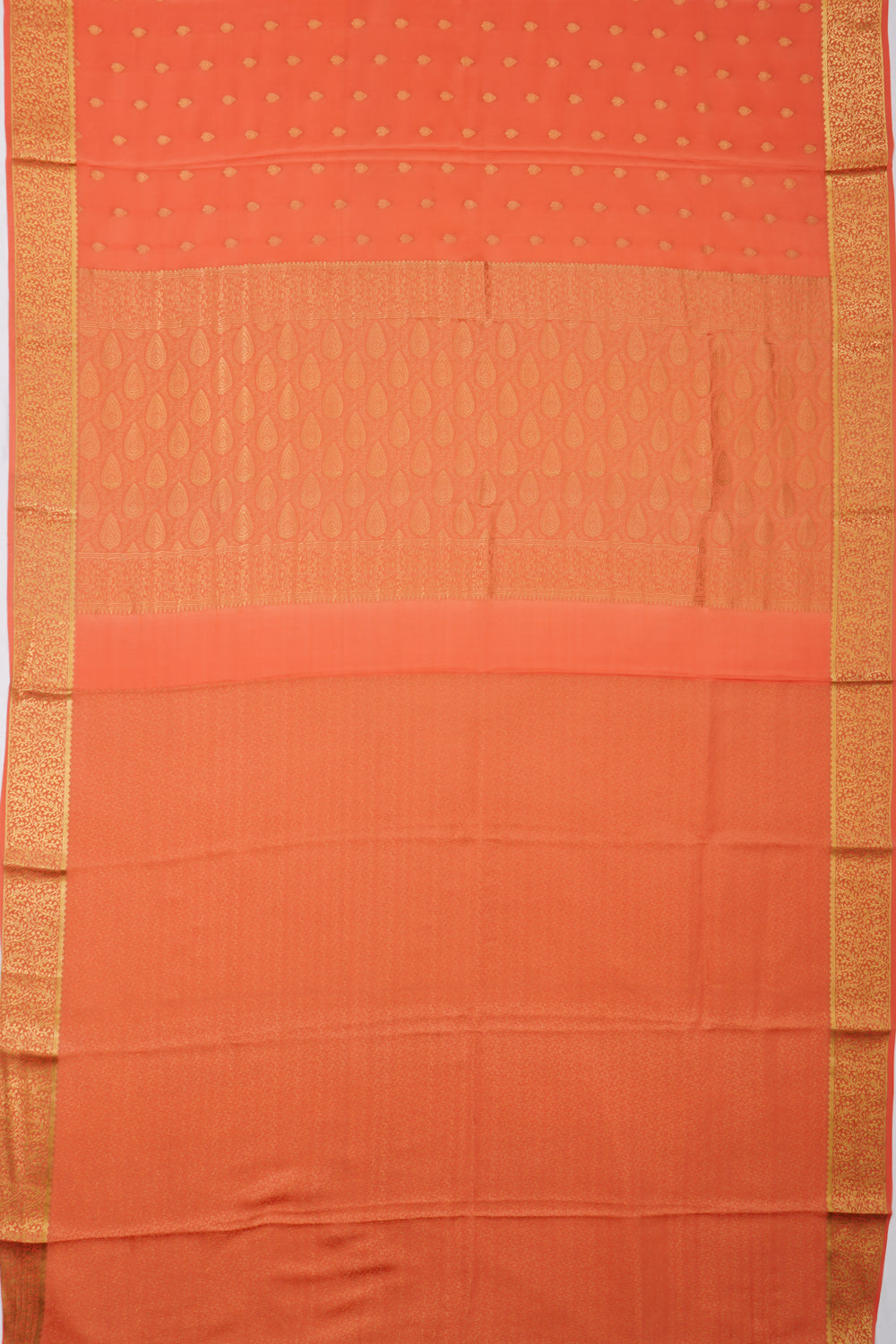 This exquisite saree comes with a plain blouse in the same vivid orange, offering a harmonious look that is both sophisticated and classic
