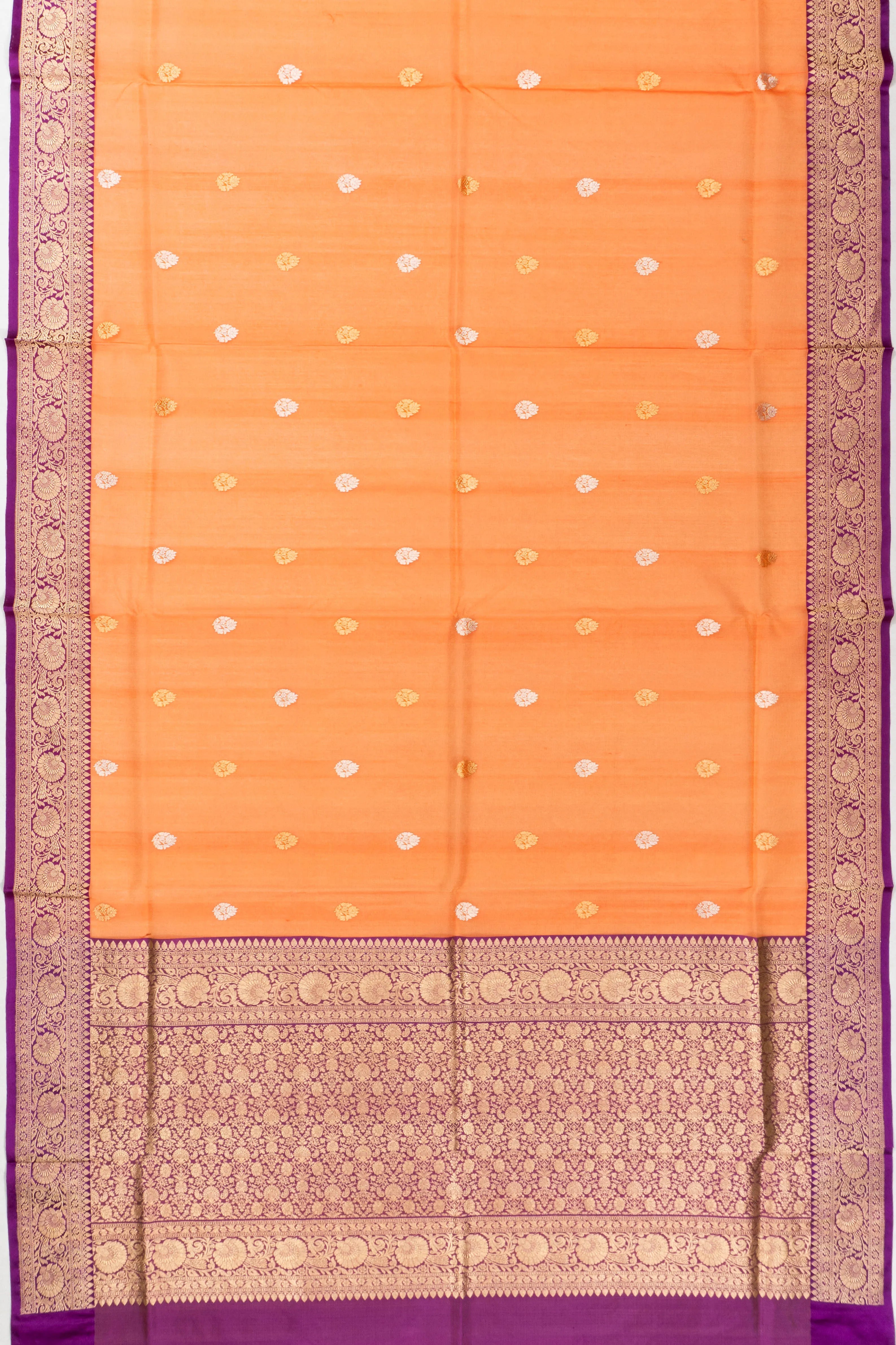 The body showcases exquisite gold zari floral buttas that dance across the vibrant orange fabric, capturing the light in every fold