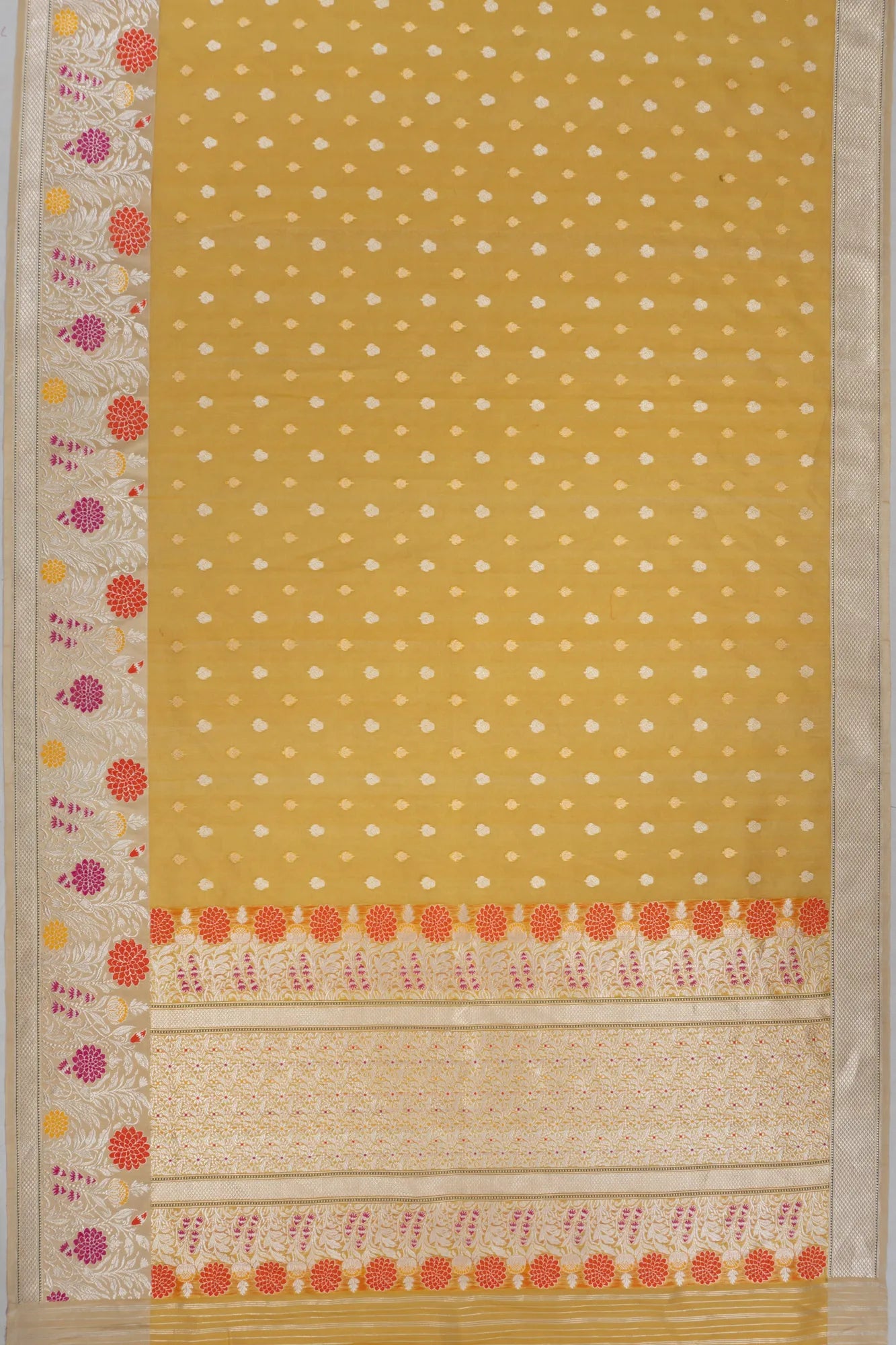 Embrace the allure of tradition with our Banarasi Kora Organza Yellow Saree, a testament to exquisite craftsmanship The saree's body is adorned with enchanting gold and silver zari flower buttas that add a touch of timeless elegance to your ensemble