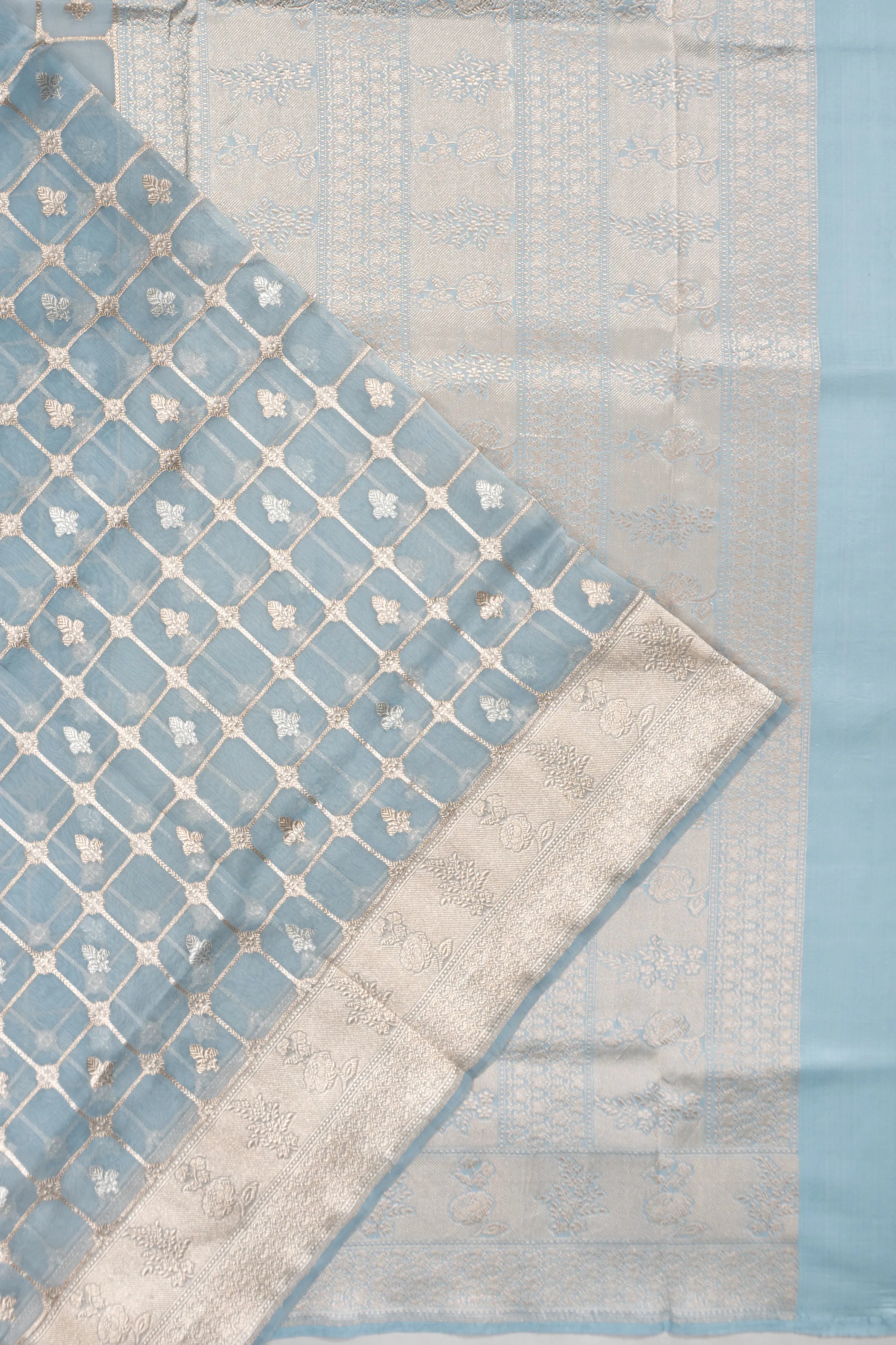 Banarasi Kora Organza Checks And Butta Light Blue Saree