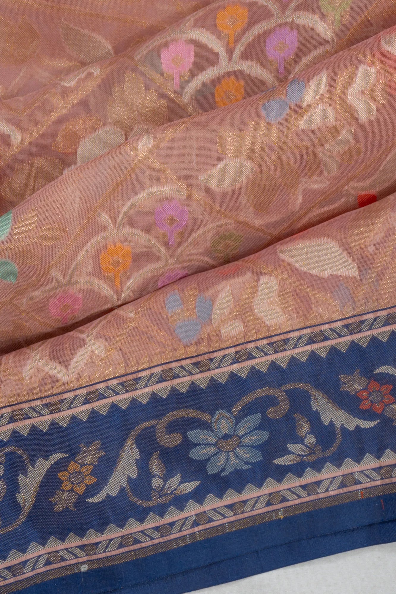 Embrace the charm of heritage and luxury with our Banarasi Kora Organza Jaal Peach Saree, an exquisite representation of traditional artistry The saree's body features a mesmerizing gold and silver zari floral jaal, creating a delicate yet opulent texture that catches the eye