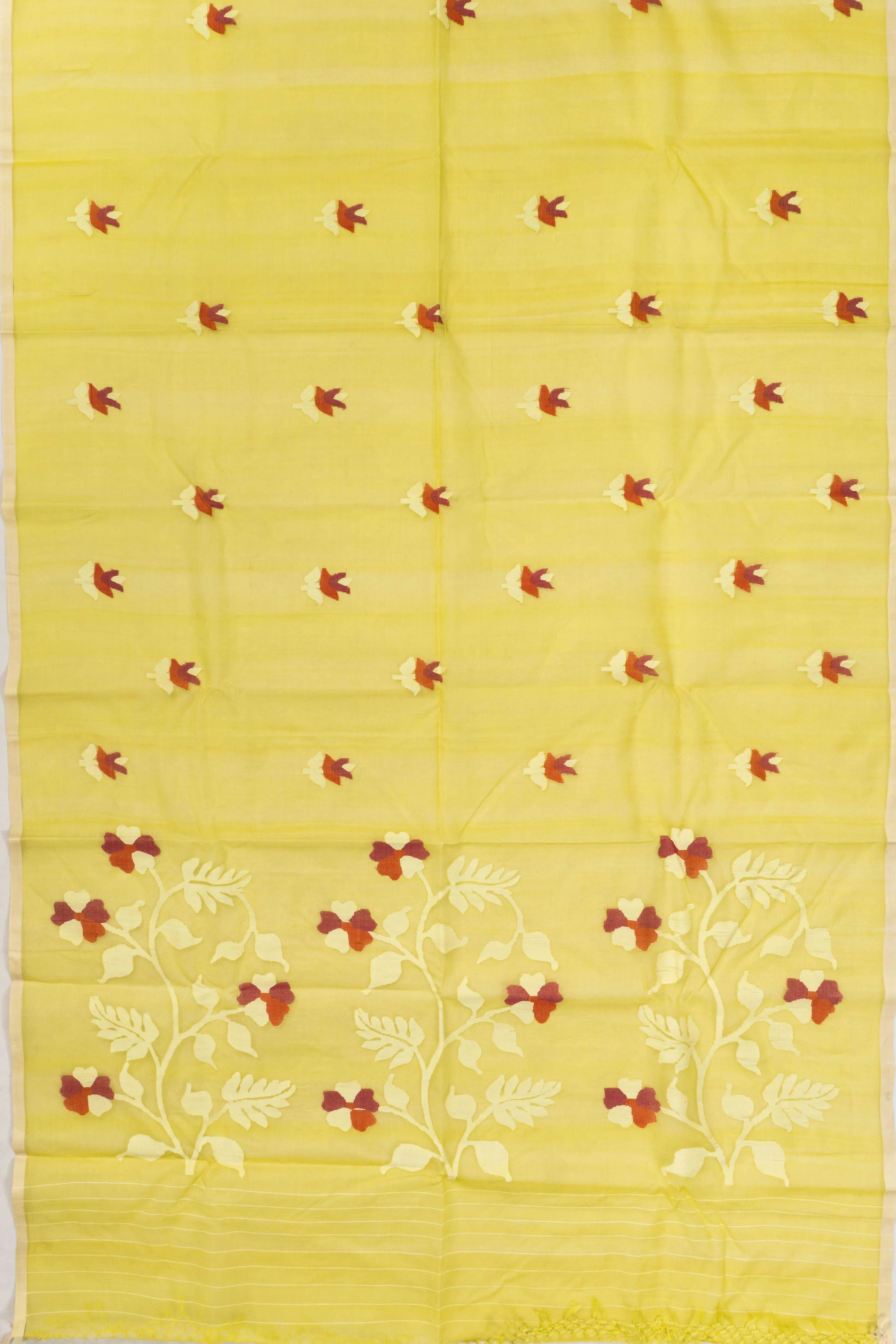 The self floral jamdani pallu offers a seamless continuation of the sarees intricate design, weaving together elegance and artistry