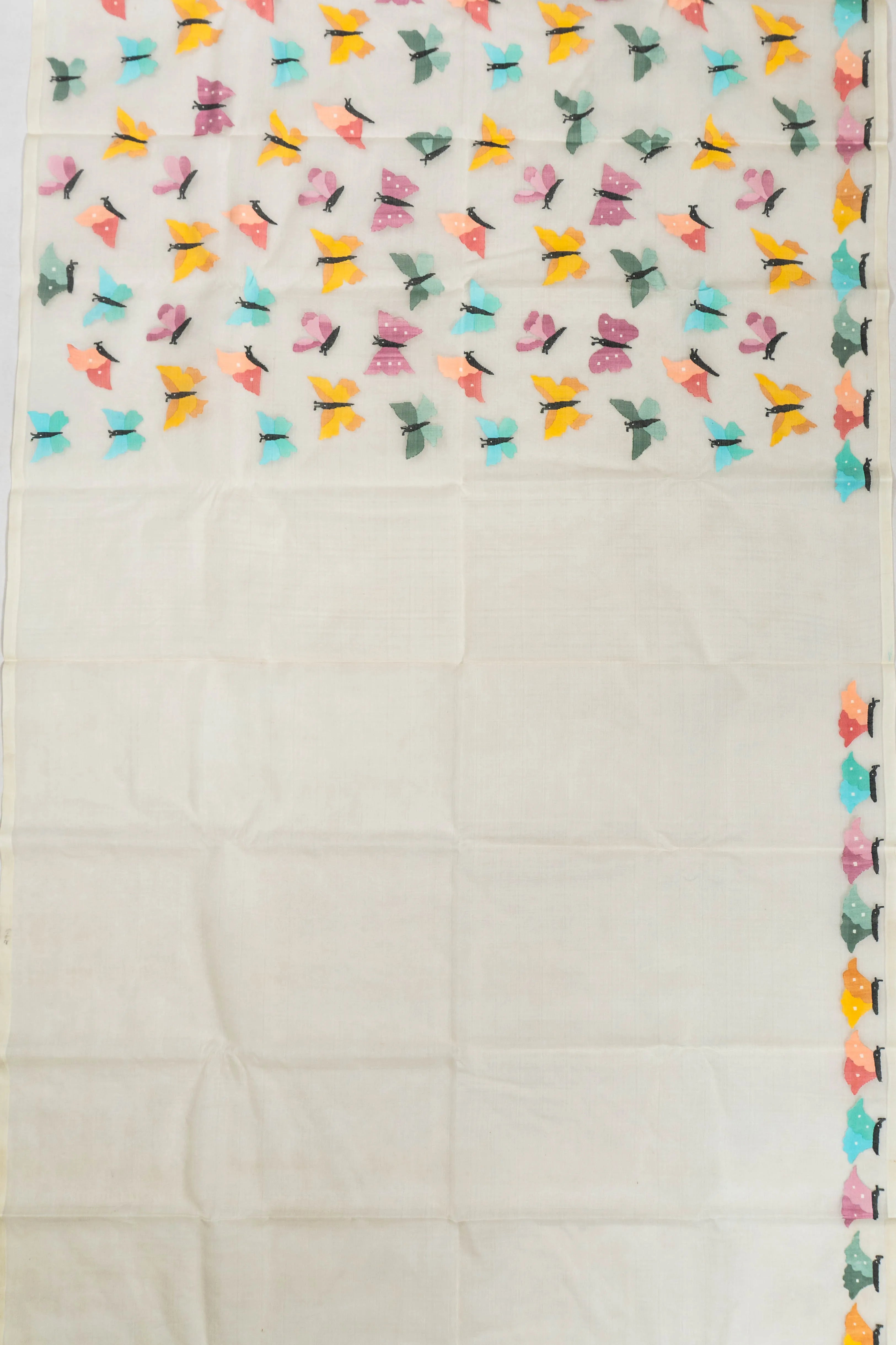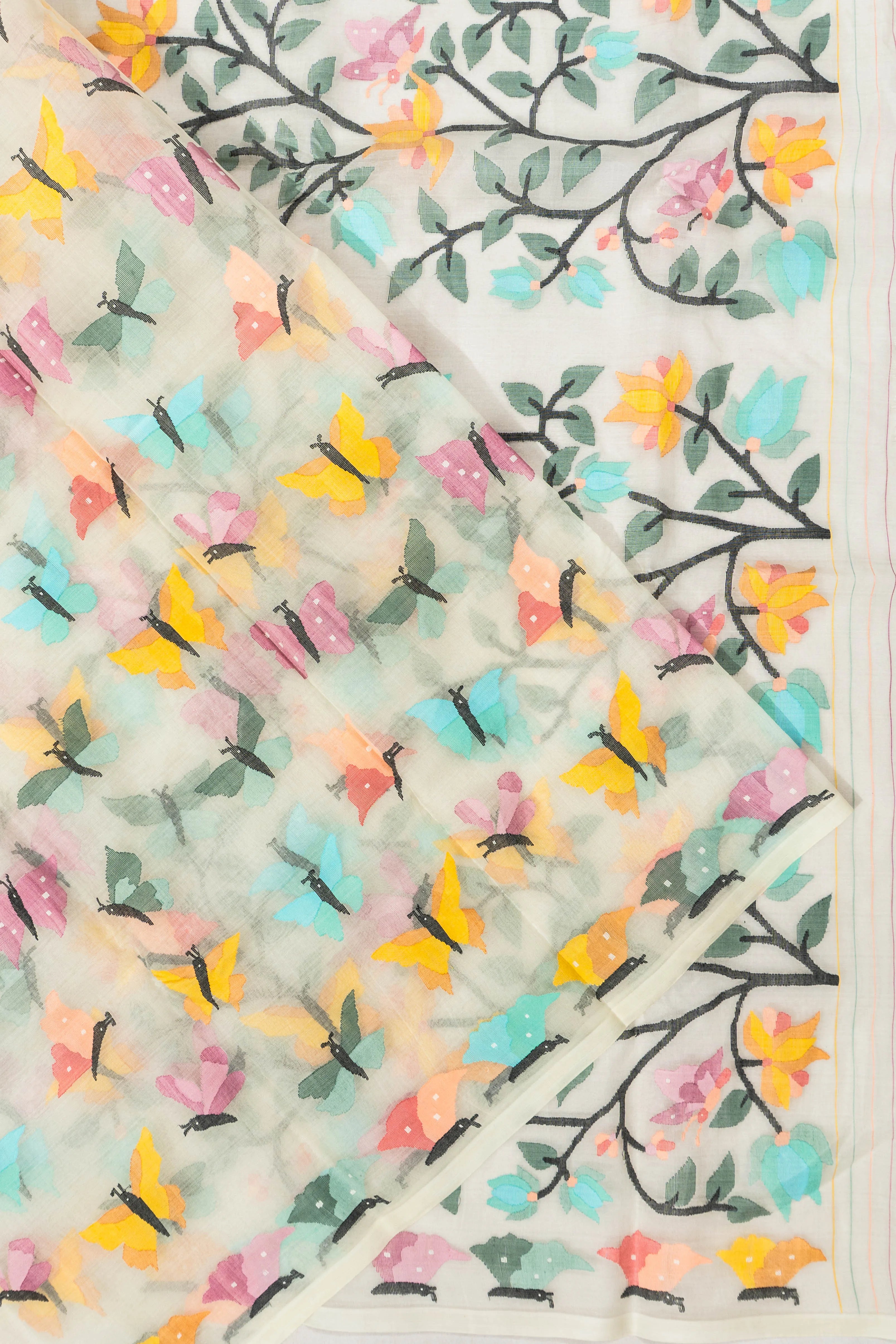 This exquisite saree features delicate butterfly motifs, skillfully crafted in jamdani weave, creating a mesmerizing dance of elegance across the pristine white fabric