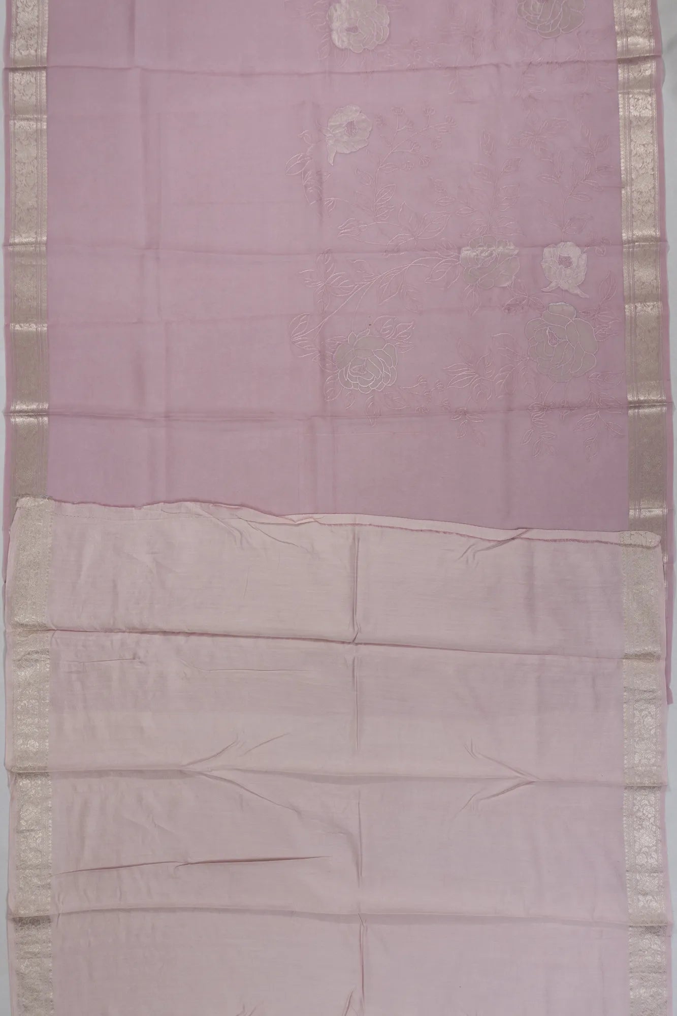 Accompanied by a plain blouse in the same soft pink hue, this saree offers a harmonious and classic ensemble