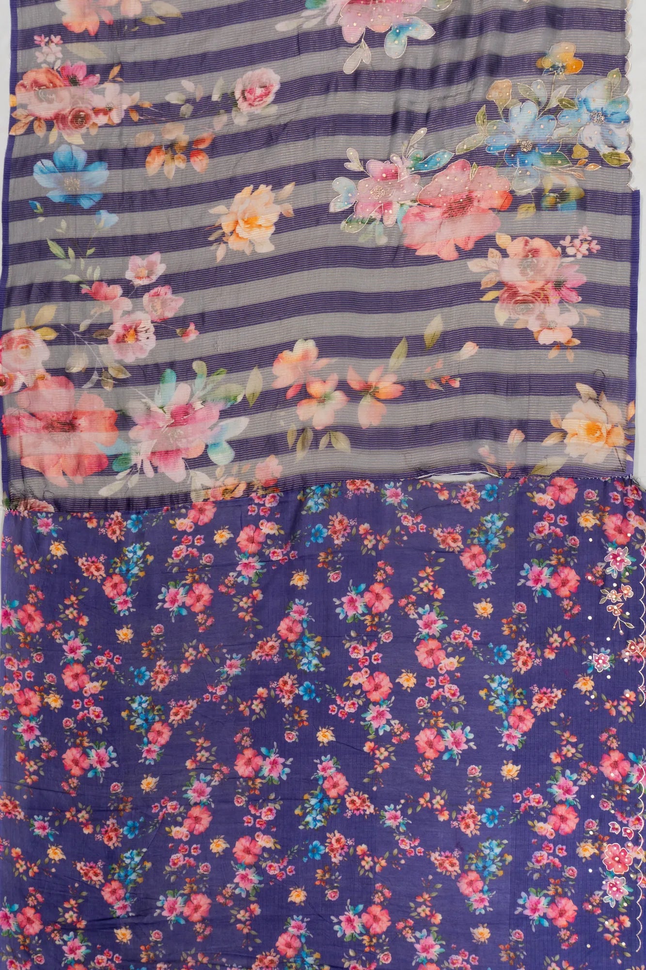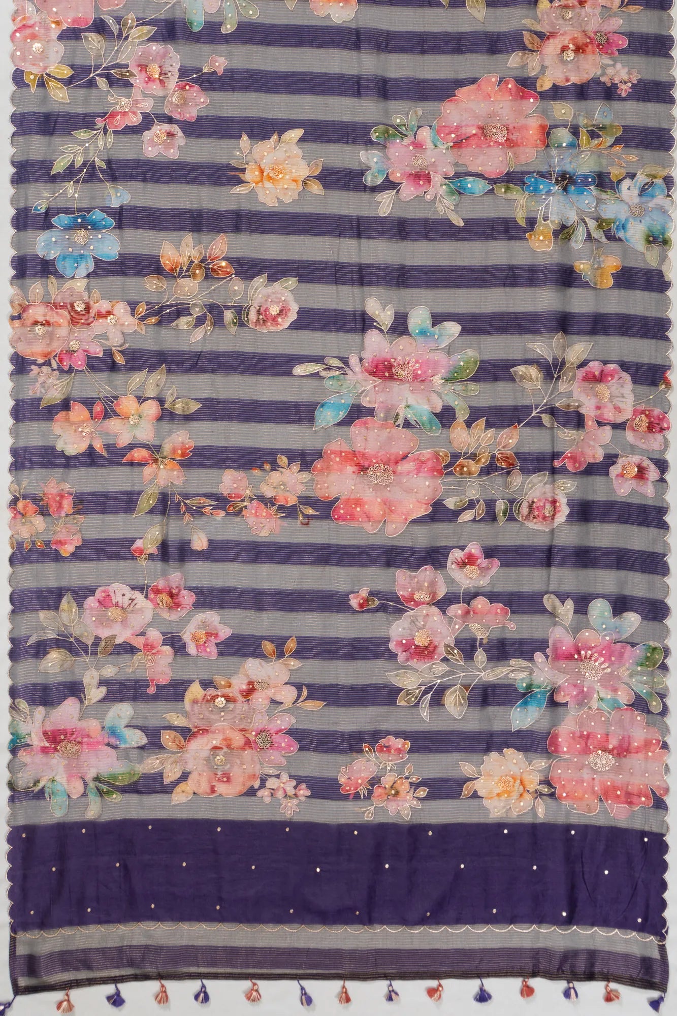 Organza Lines And Printed Violet Saree With Scallop Edge