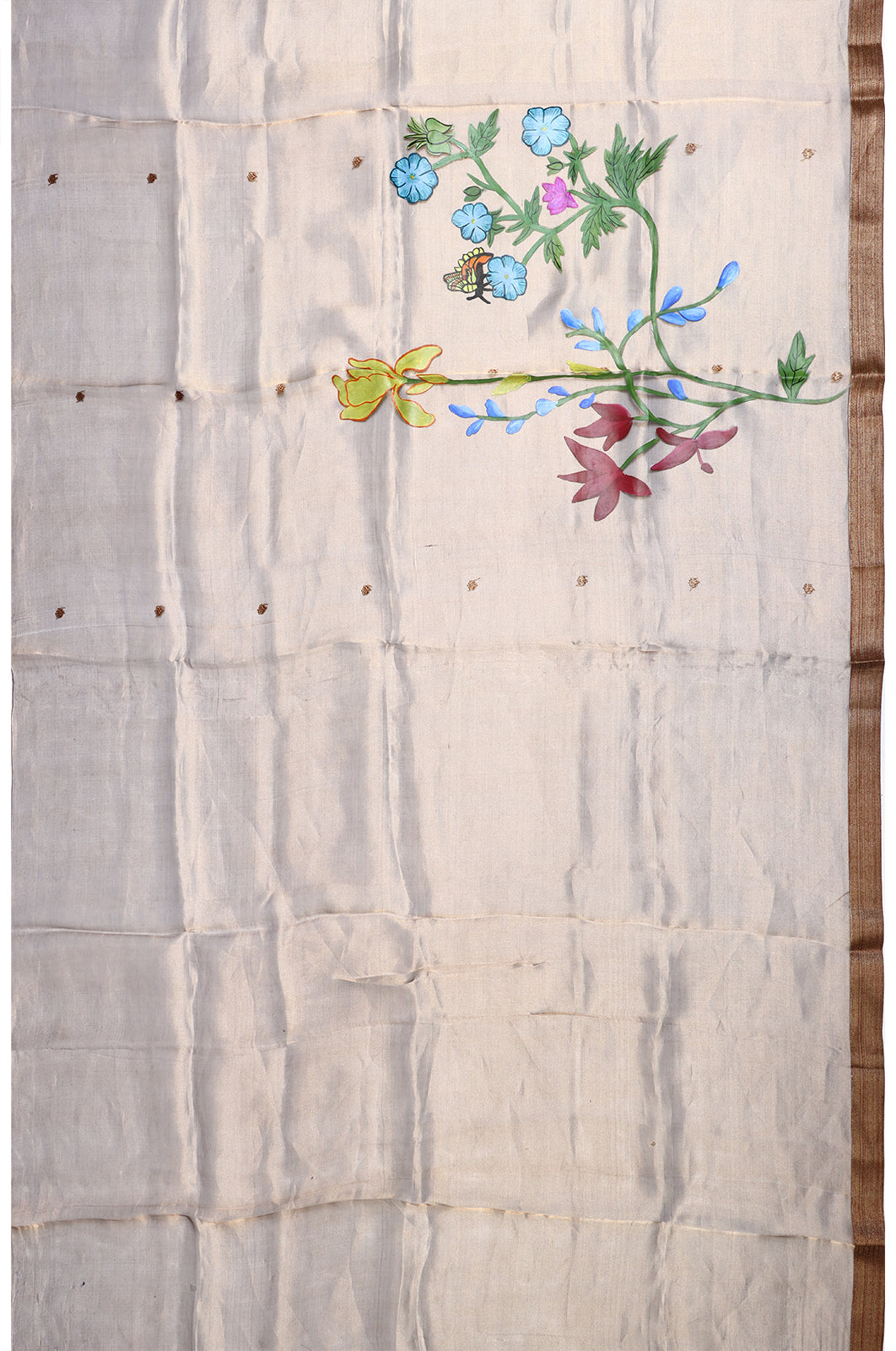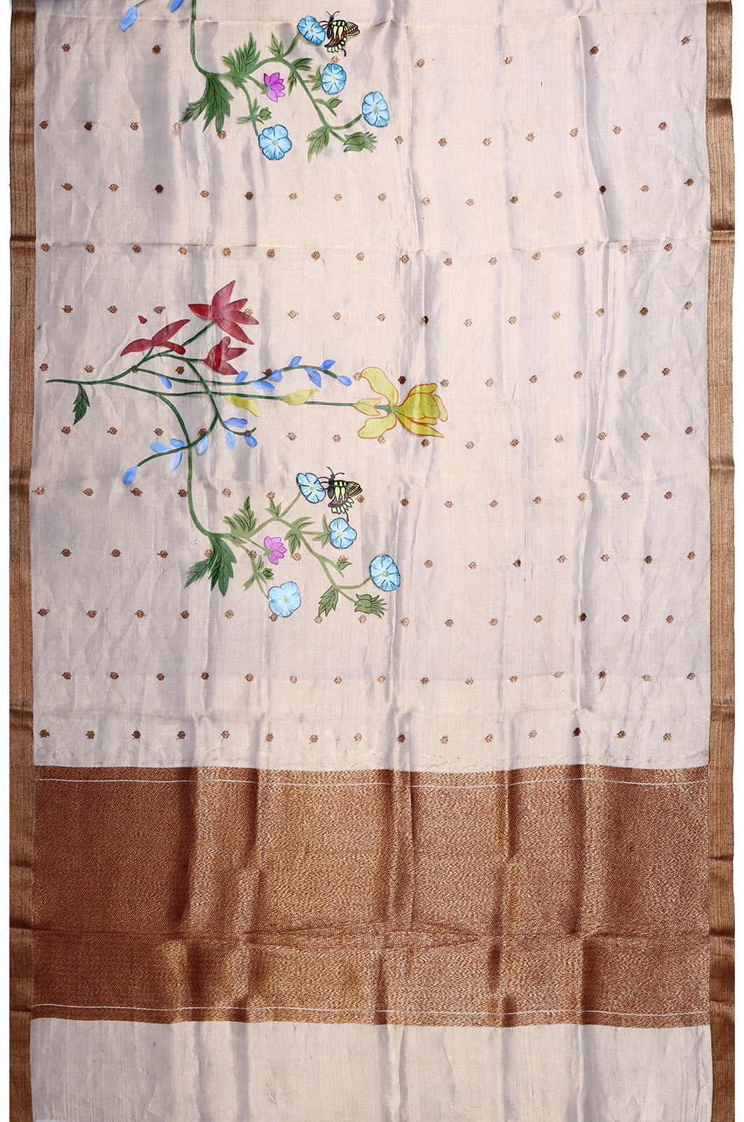 The saree's body is crafted from luxurious tissue, adorned with delicate hand-painted designs that add a touch of artistic finesse to its rich brown hue