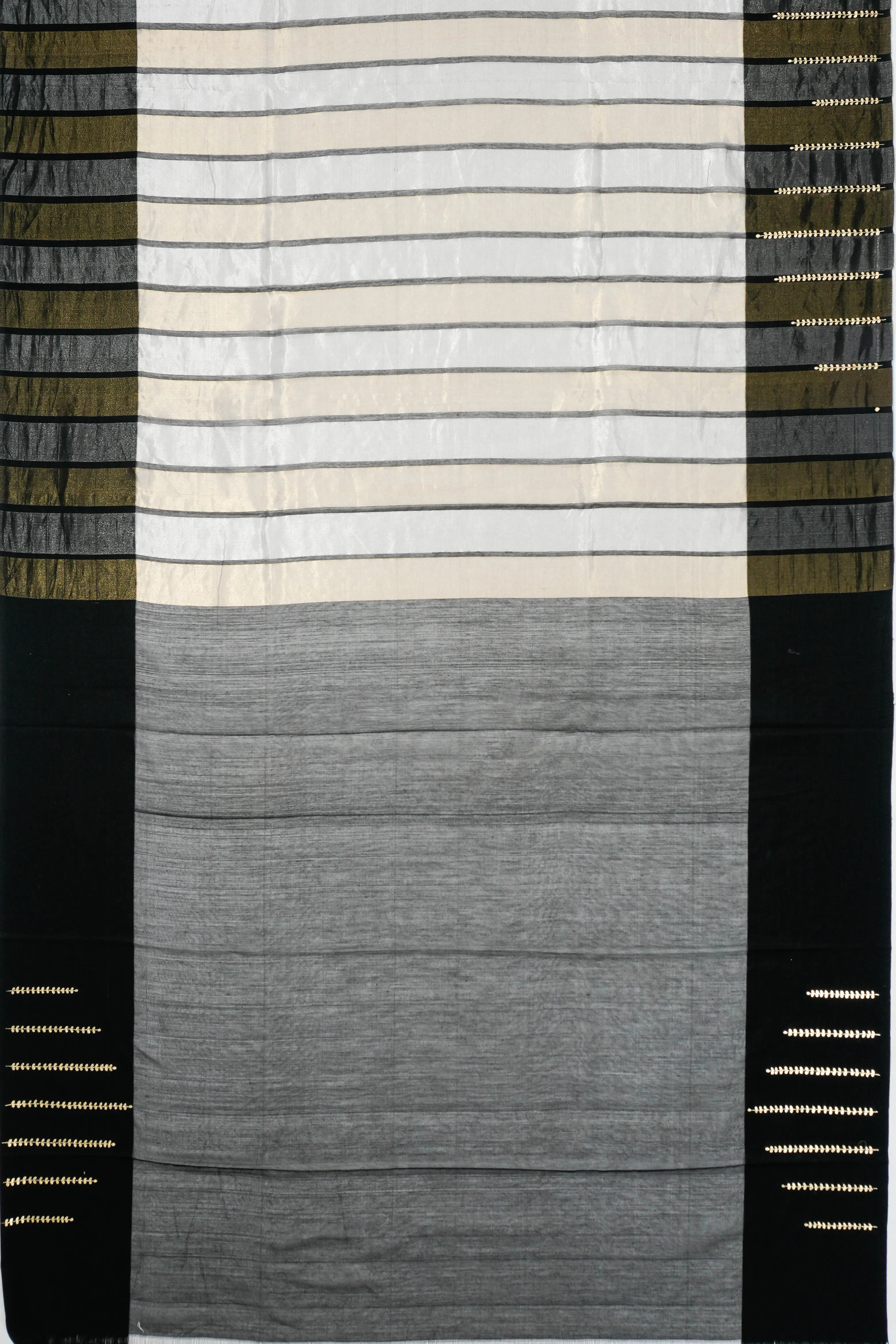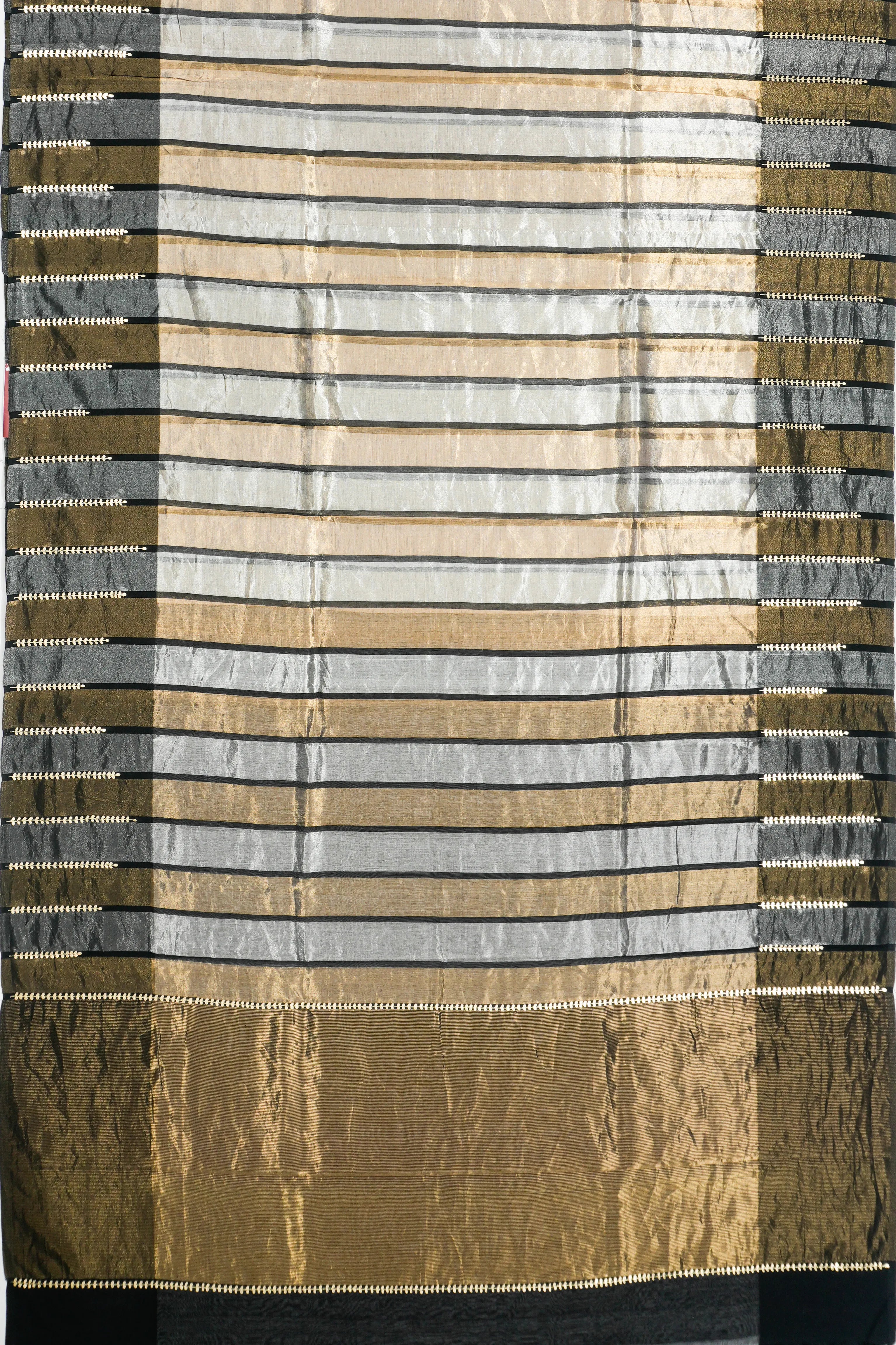 The saree's body is adorned with graceful gold and silver zari vertical lines, creating a sophisticated interplay of shimmer and elegance