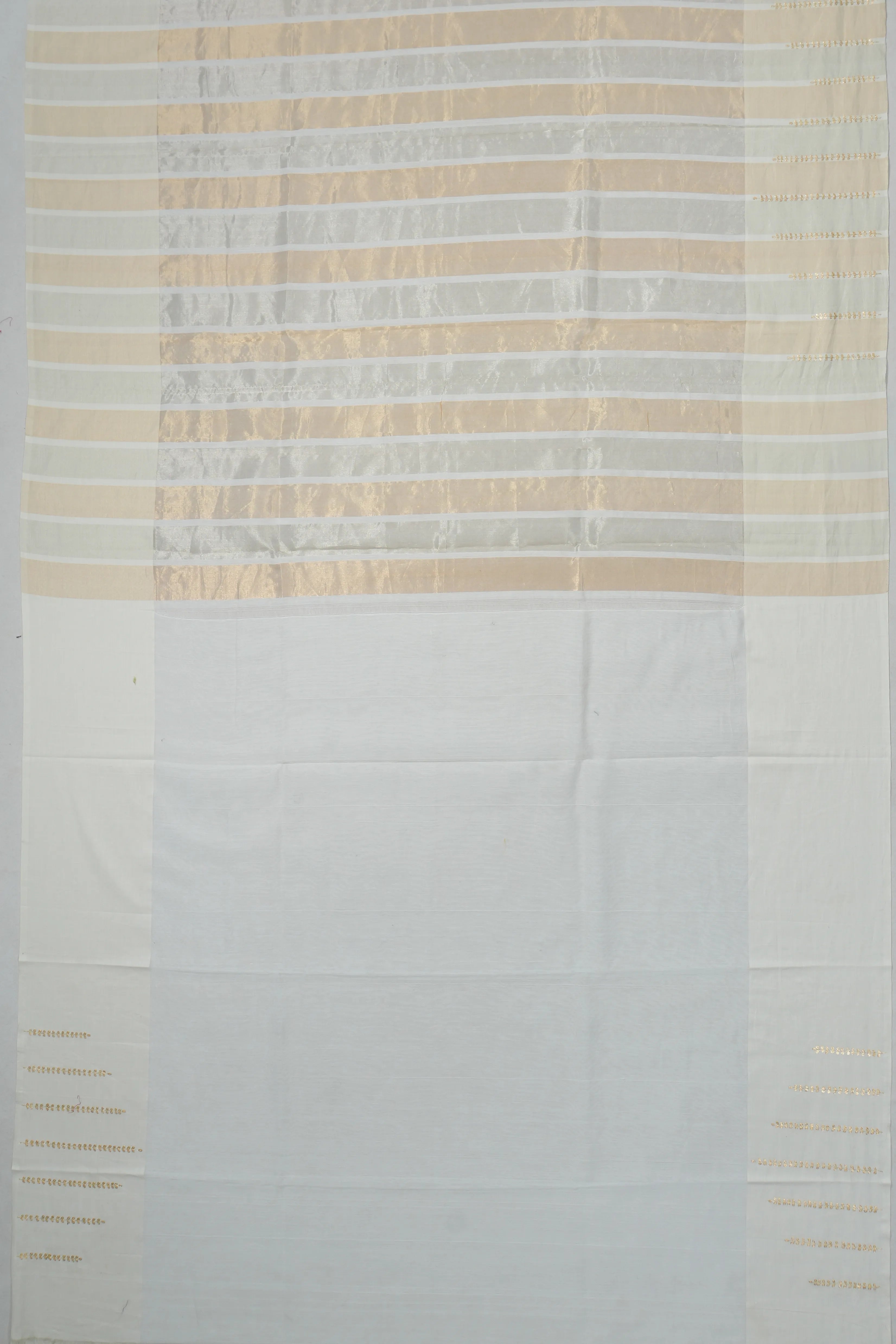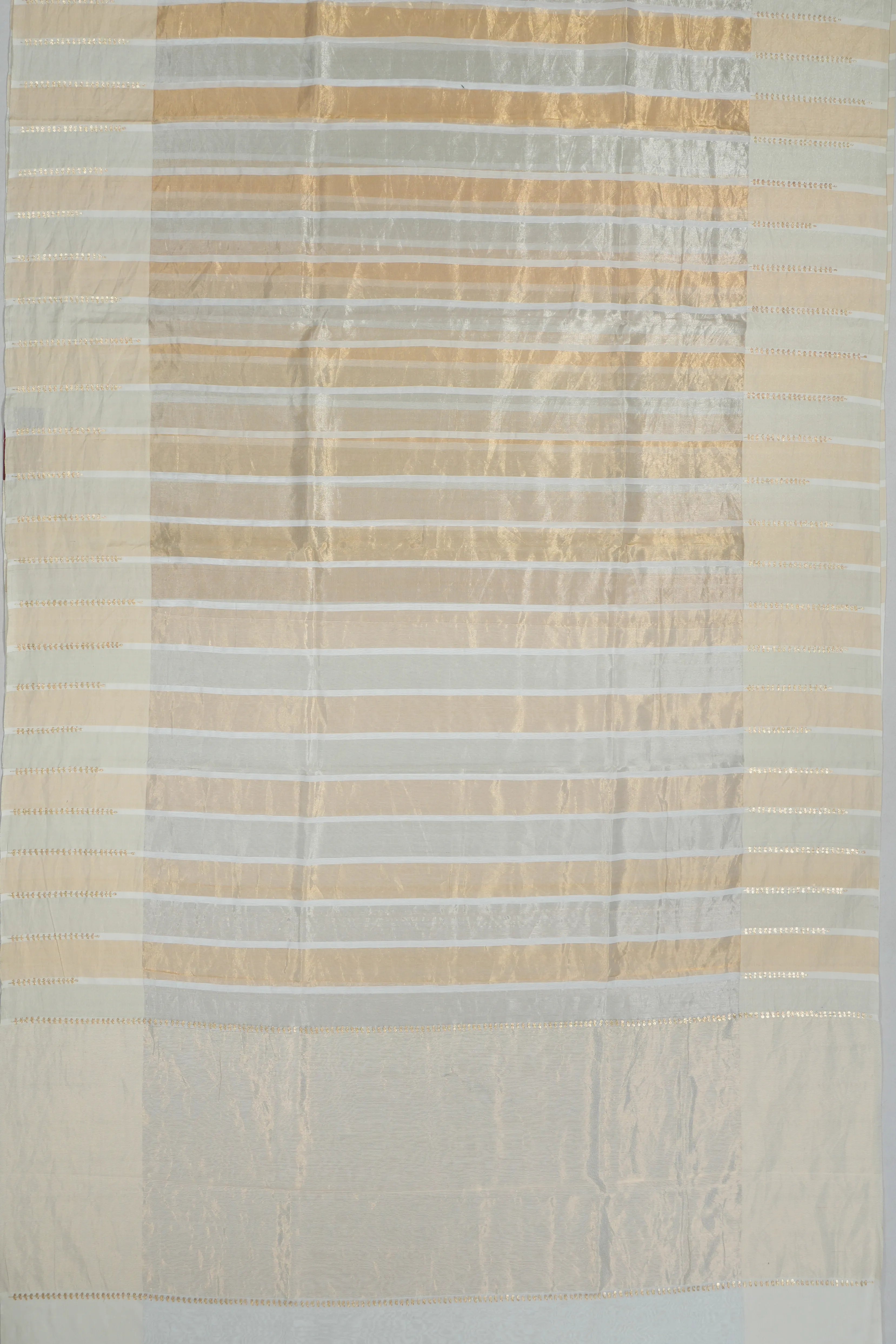 The body is adorned with graceful gold and silver zari vertical lines, creating a shimmering tapestry that captures the essence of timeless beauty