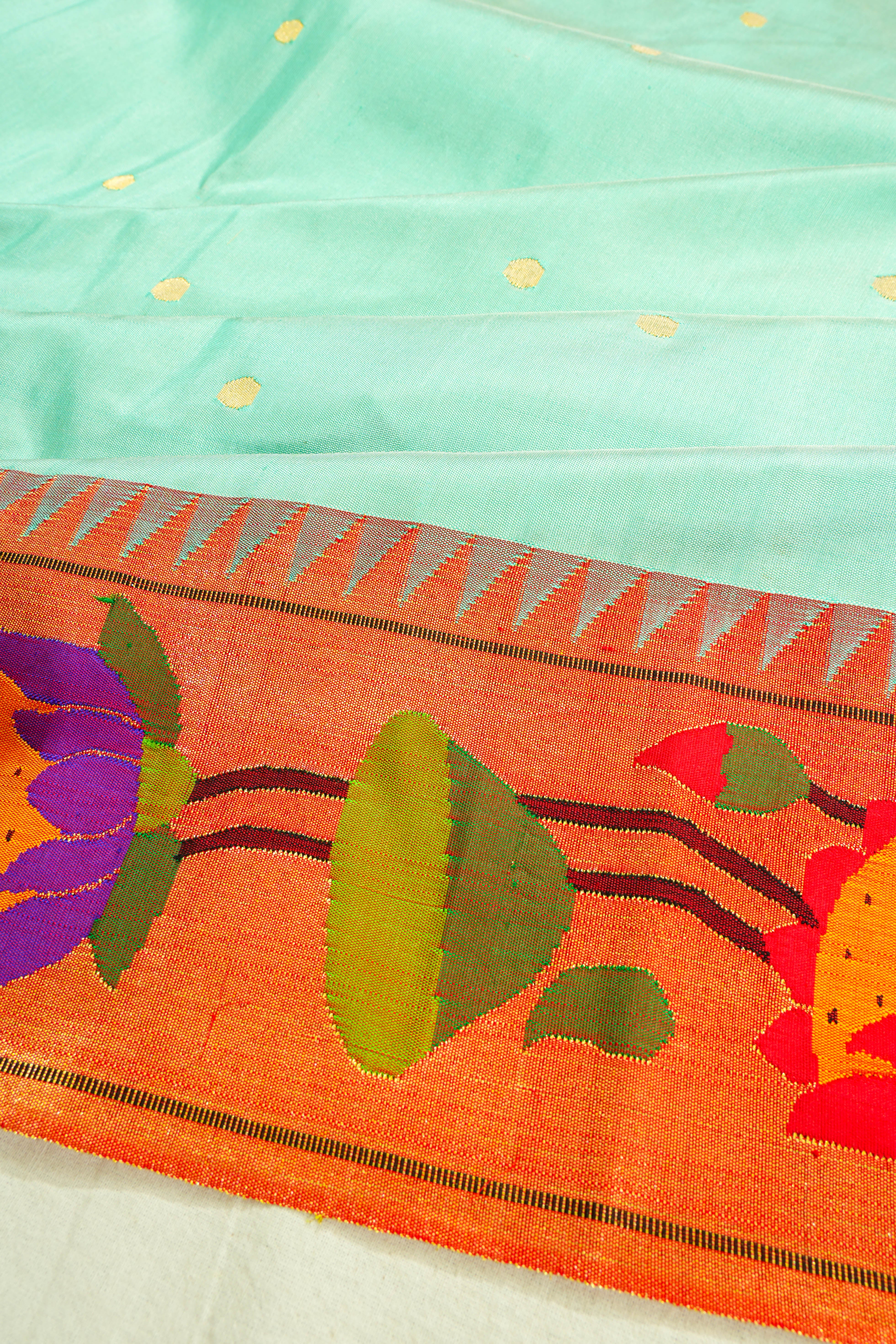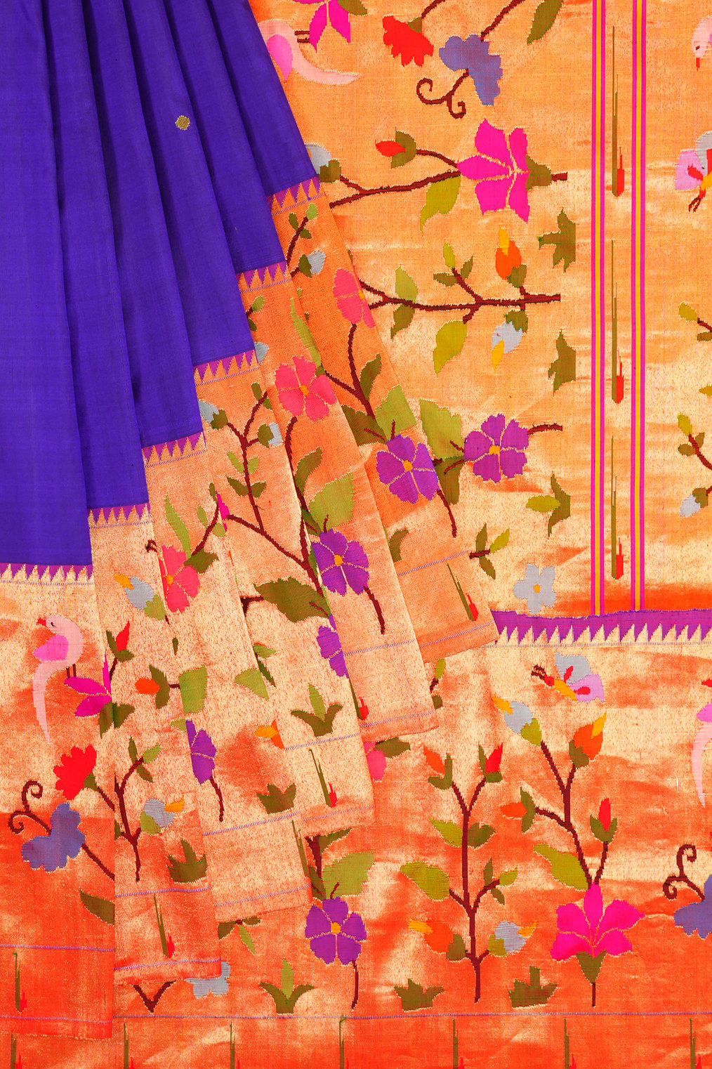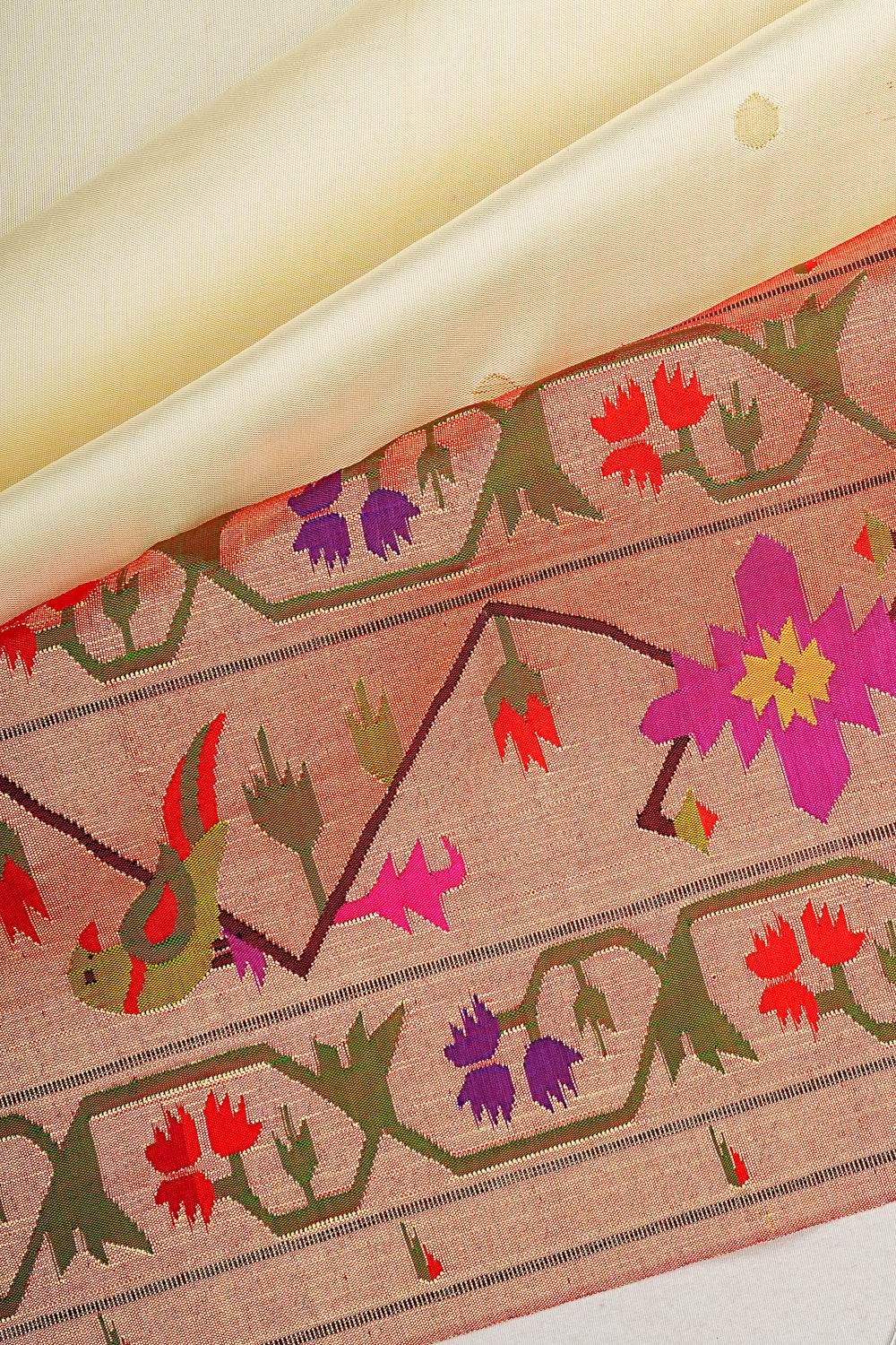 The romantic Asawali border celebrates nature through intricate floral vine motifs, characterized by delicate creepers, jasmine blossoms, and rose patterns that seem to bloom across the silk canvas. These borders require exceptional skill to achieve the flowing, organic appearance that makes each piece feel like a garden captured in silk. The Asawali design particularly complements blue paithani saree and pink paithani saree colorways, creating pieces that embody feminine grace.