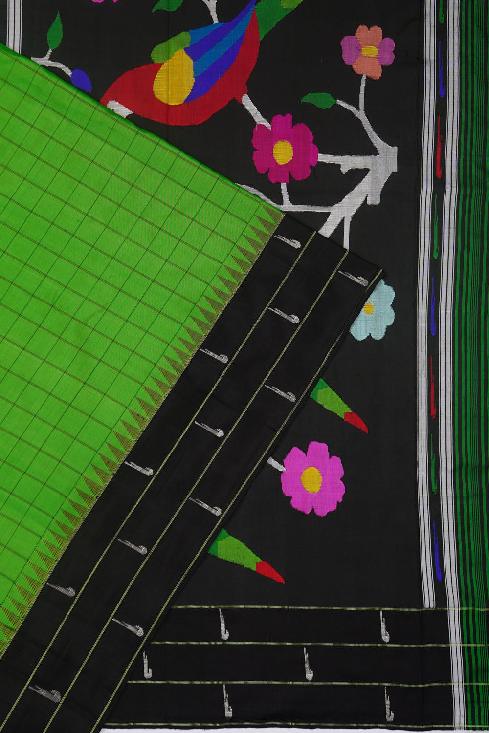 Paithani Silk Checks Green Saree With Triple Muniya Border