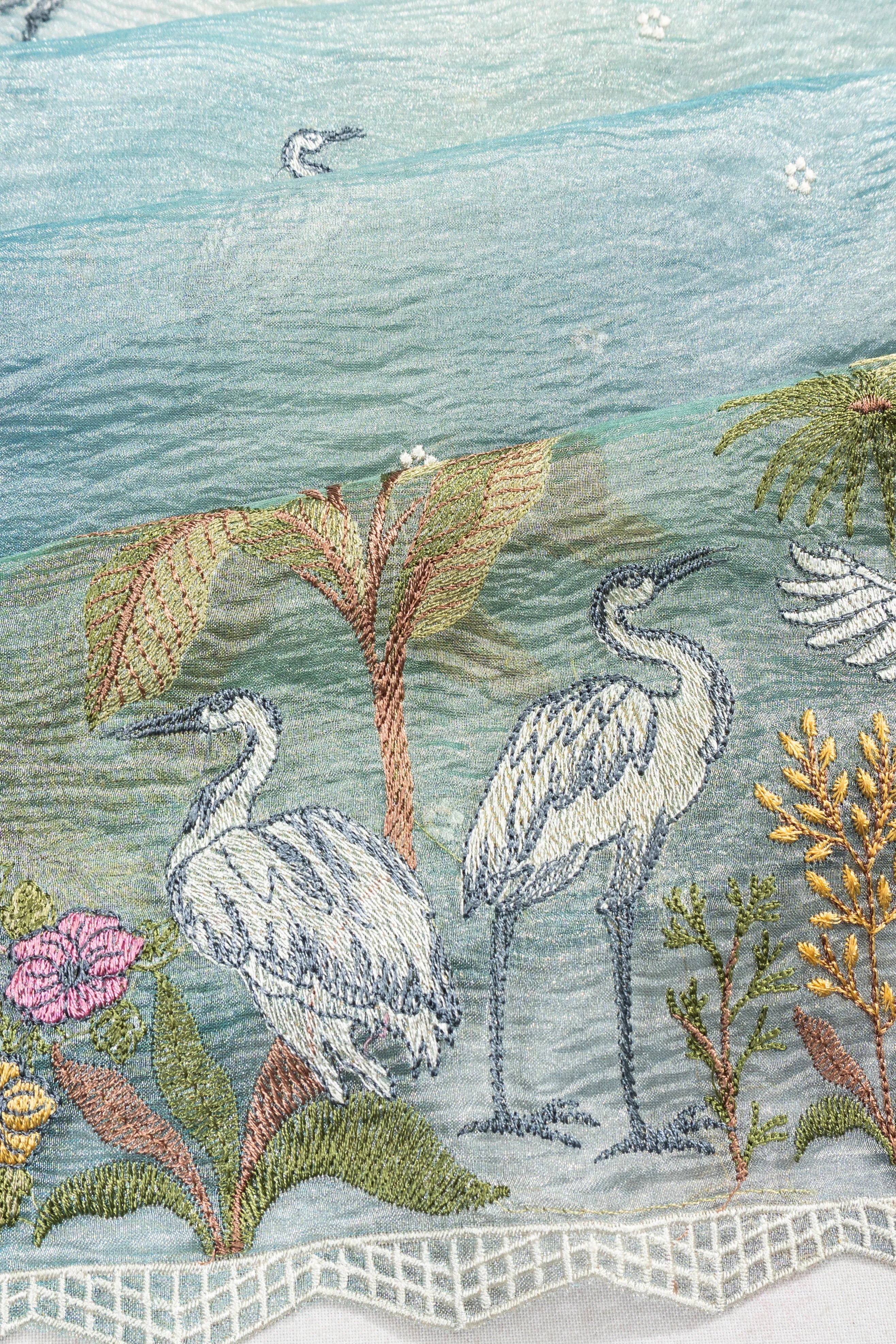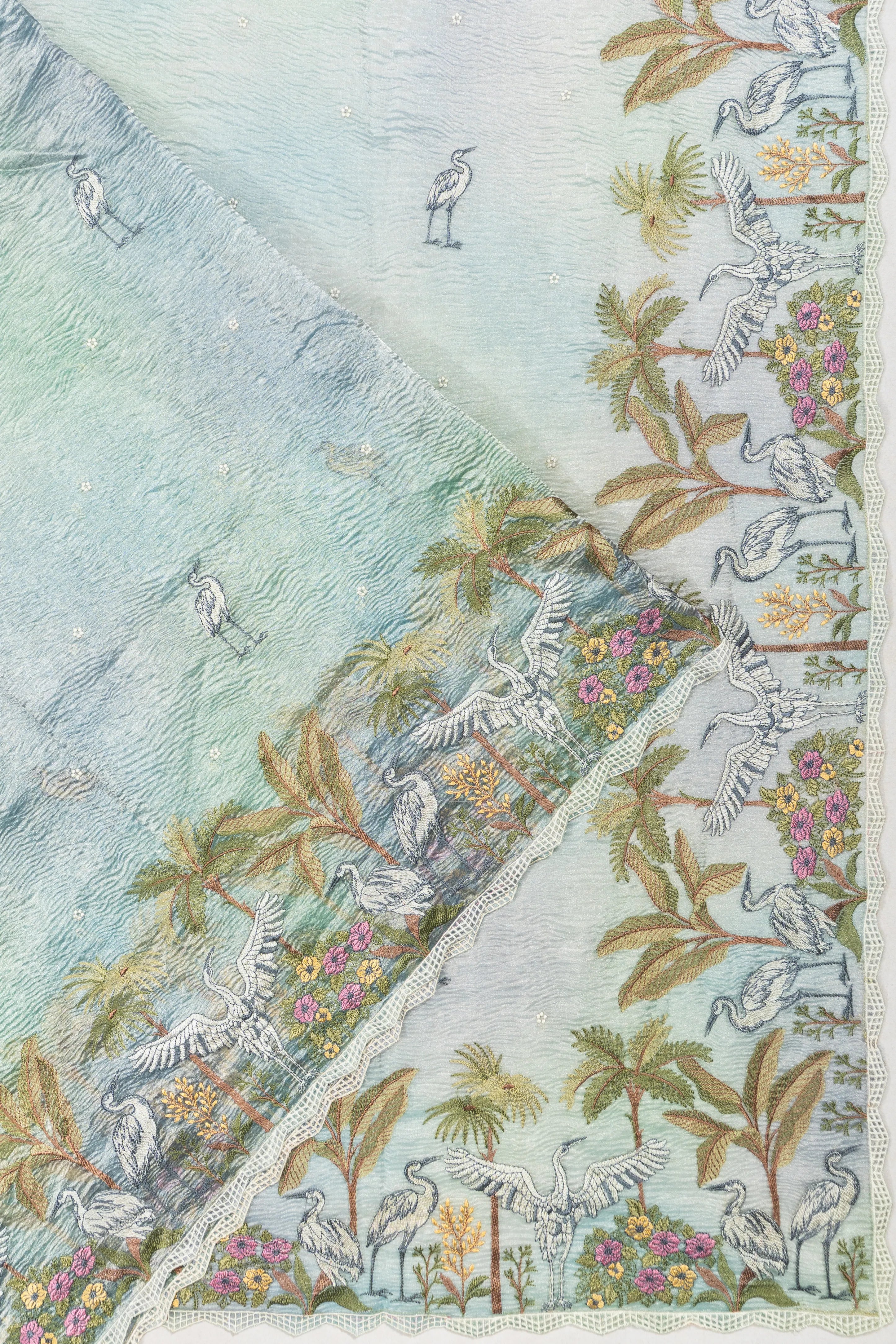 The border, crafted without zari, showcases a delicate array of embroidered trees, birds, and flowers, accentuated by a petite lace trim
