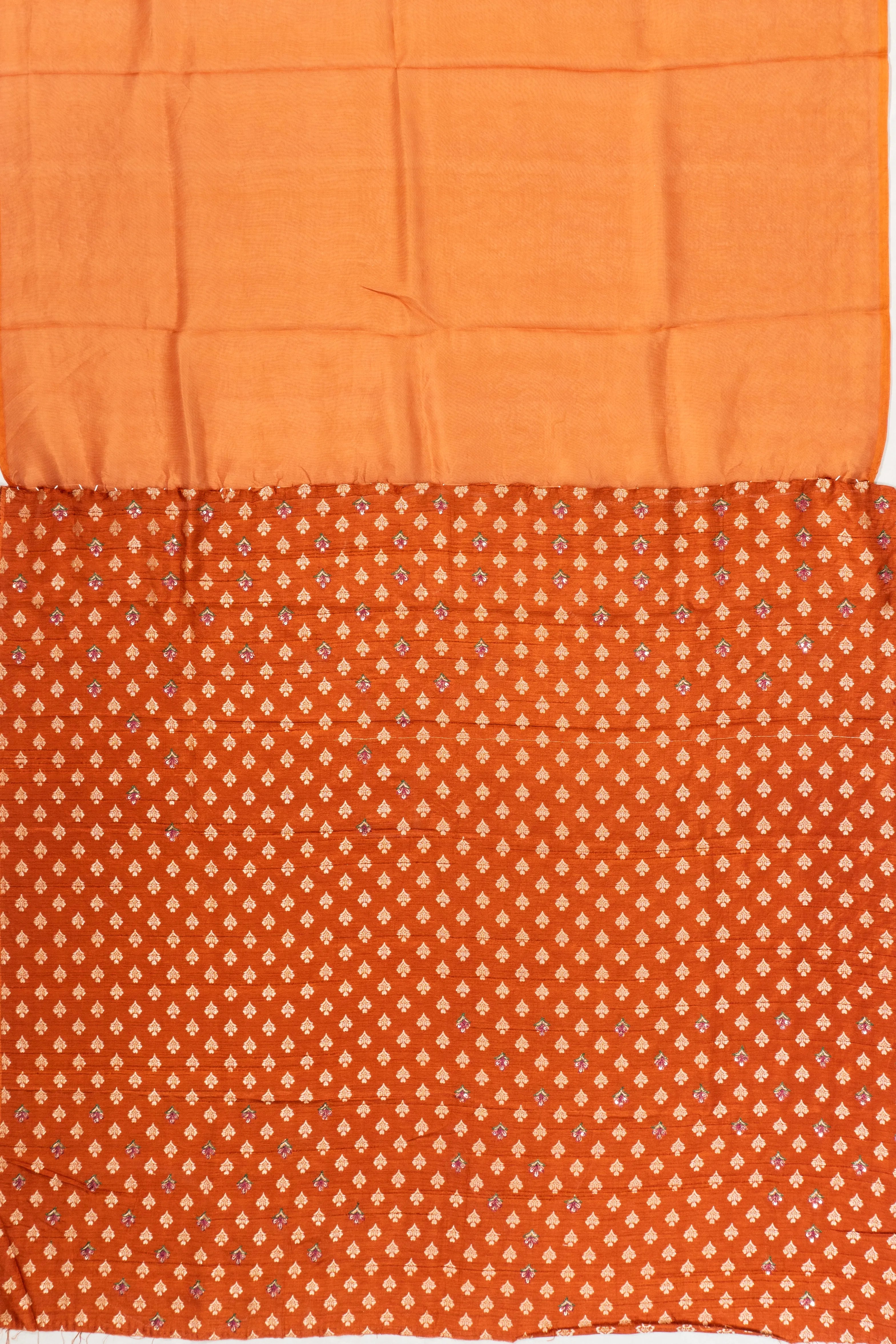 Embrace the allure of tradition with the Organza Butta Embroidery Burnt Orange Saree, a masterpiece that showcases exquisite embroidered threadwork The saree's body is adorned with delicate flower buttas, reflecting an elegant charm that speaks to heritage-rich craftsmanship