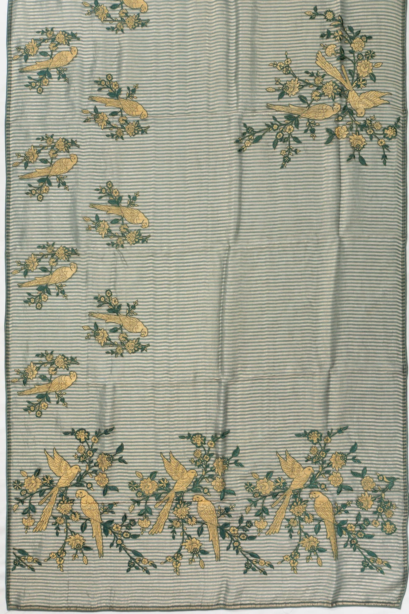 Embrace the grace of heritage with the Organza Lines Green Saree, a stunning blend of tradition and elegance This saree beautifully features gold zari vertical lines that cascade down the fabric, adorned with charming embroidery parrot motifs nestled within floral buttas, creating a harmonious dance of nature-inspired design