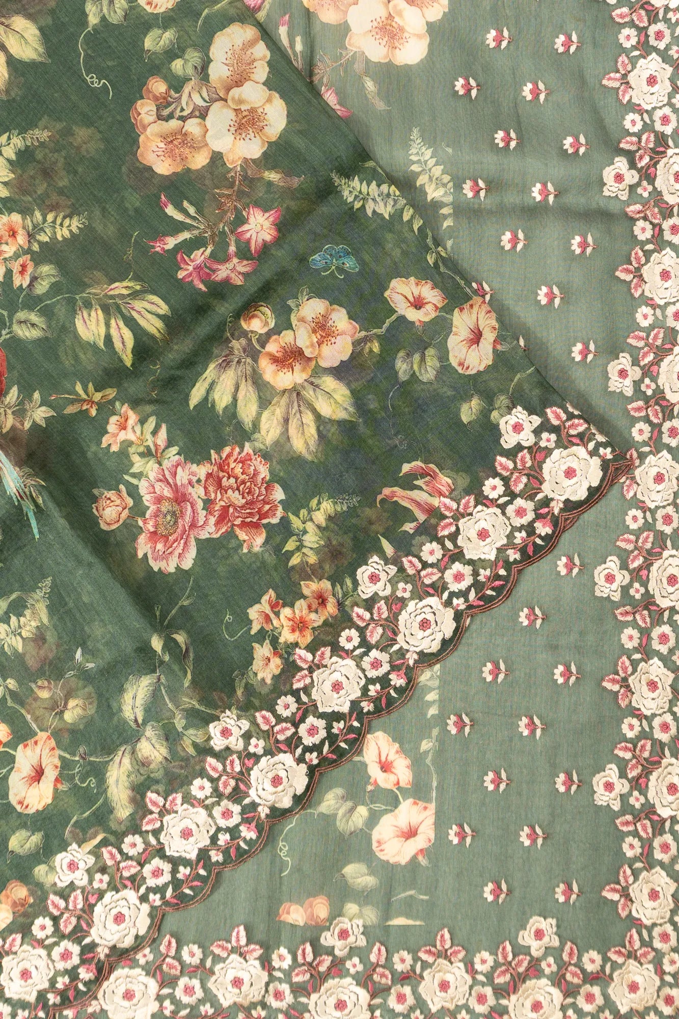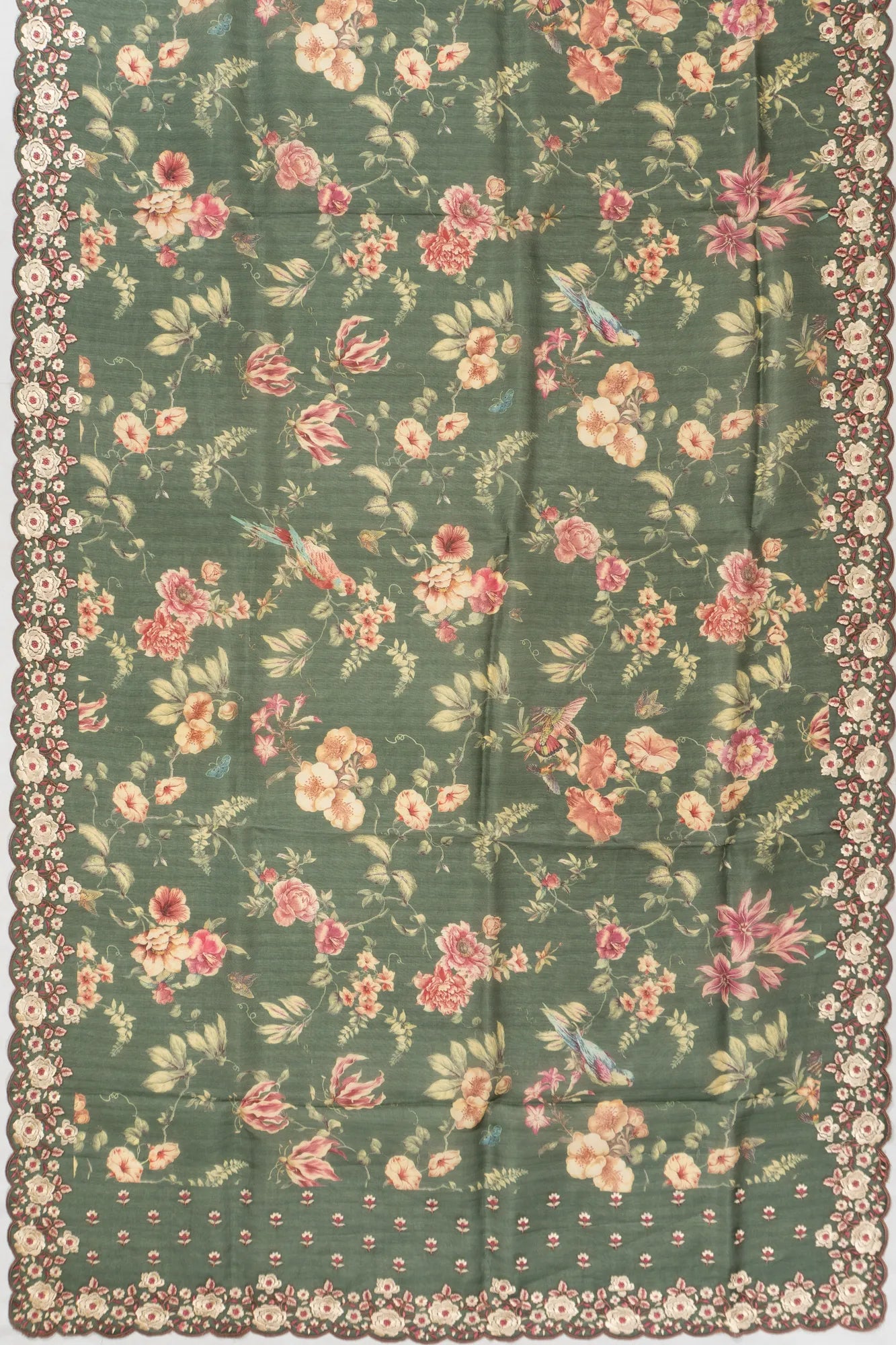 Organza Printed Green Saree With Embroidery Scallop Border