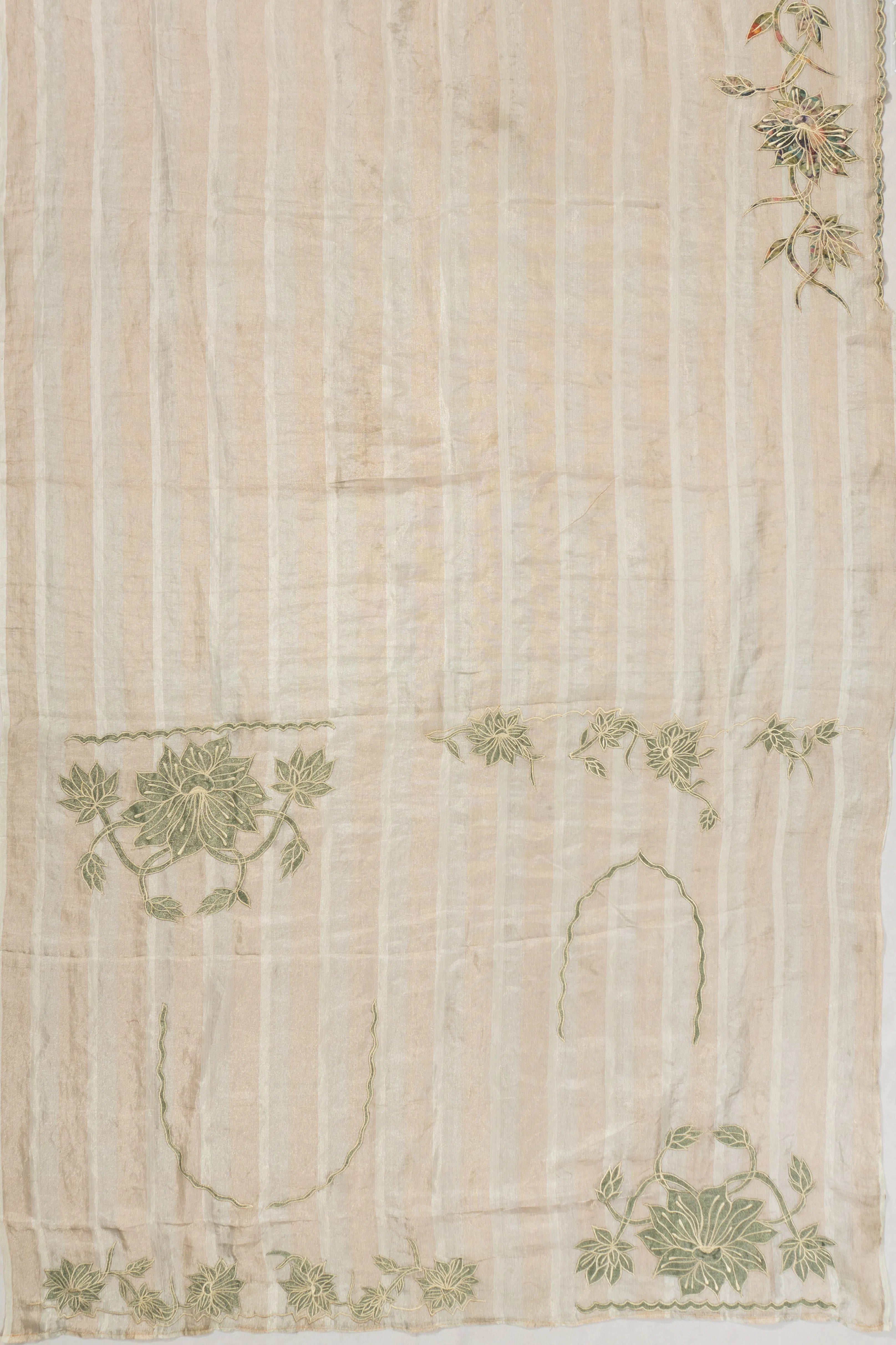 The saree's body is adorned with luxurious gold zari printed floral creeper brocade and gold horizontal stripes, creating a symphony of refined motifs against the creamy backdrop