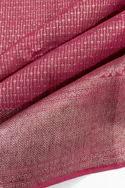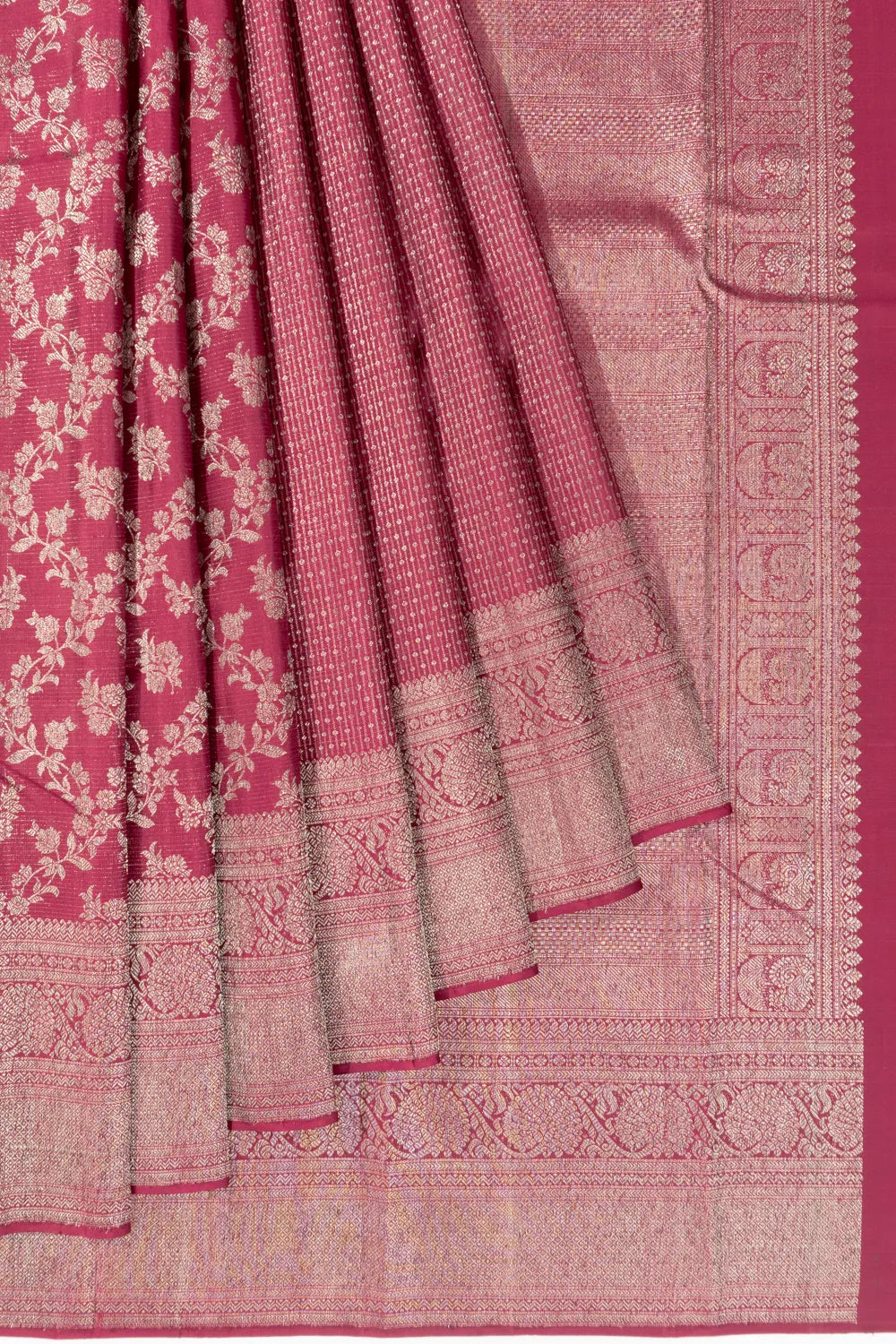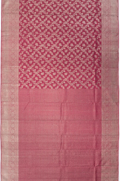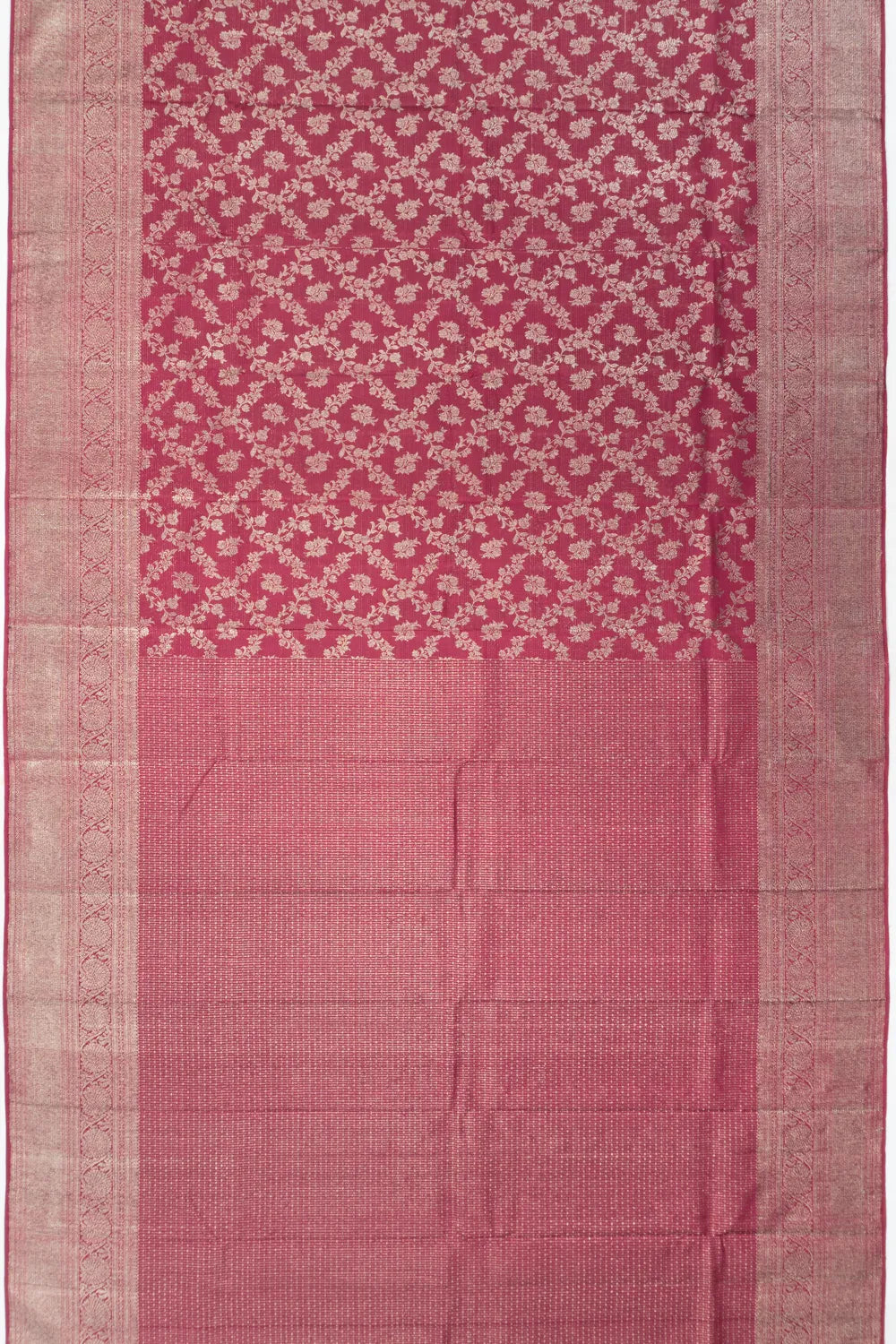 Maroon silk featuring an elegant blend of antique zari vertical lines and rich floral brocade, creating a striking half-and-half effect.