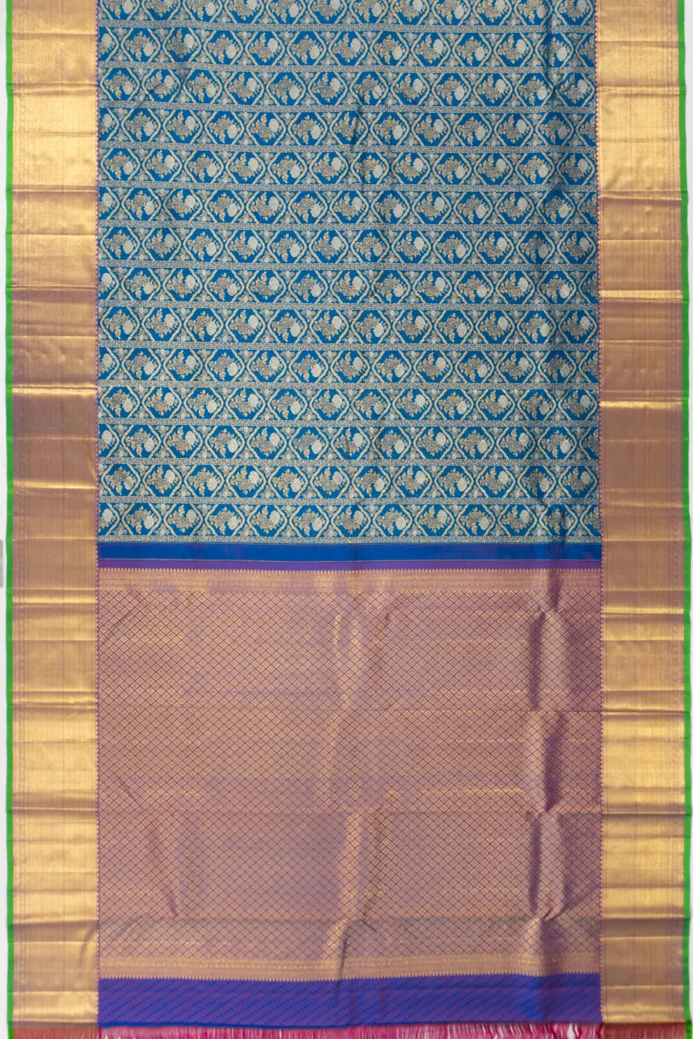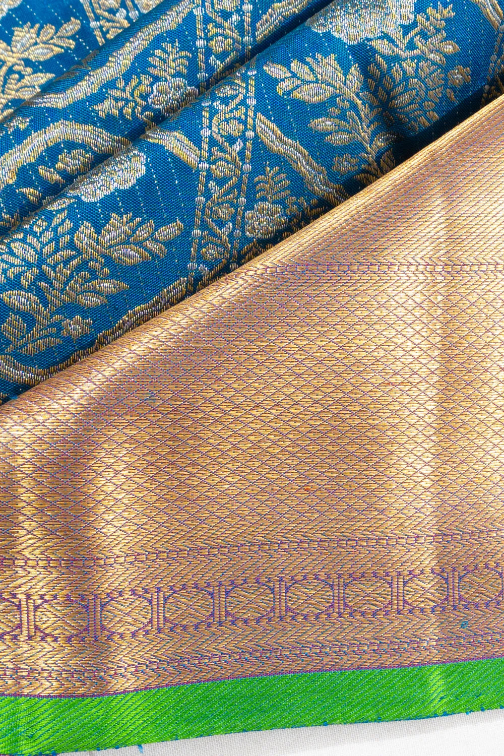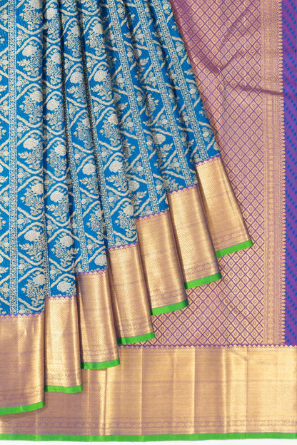 Stunning blue base intricately woven with gold and silver zari floral brocade, exuding timeless elegance and luxury.